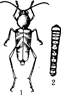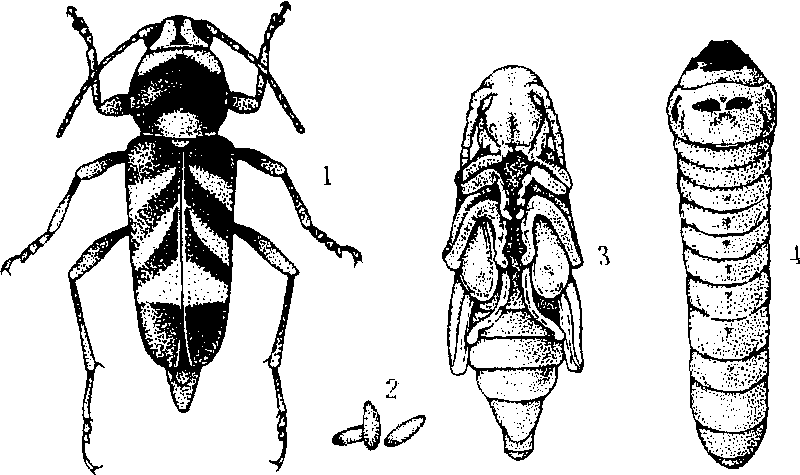 生活习性 在辽宁1~2年发生1代,以不同龄期的幼虫在枝干内越冬,次年4月上、中旬开始活动,以老熟幼虫越冬者,6月下旬至7月上旬为羽化高峰,羽化后不久即交尾产卵。幼虫孵化后蛀食到11月上旬越冬,第2年继续蛀食为害,至7月下旬至8月间羽化,完成1个世代需14个月。成虫再产卵孵化的幼虫,要越两个冬季,至第3年6月羽化,完成1个世代需22个月,即完成先后两个世代,需三年。世代重迭,在桑树生长发育期间,各虫态均有发生。成虫羽化后从原蛀入孔咬破表皮出孔,出孔后即行交尾,卵产在树干的缝隙、裂口内。成虫有较强的飞翔力,不再取食,但需饮水。卵期7~20天,孵化后幼虫沿形成层由上向下蛀食,每隔一段距离向外蛀一小米粒大小的通气孔,虫粪被树液稀释后成条状由通气孔排出堆积于树表,状如蚯蚓粪堆。幼虫老熟前蛀入木质部,形成“⌝”形隧道,以木屑堵住隧道上方,化蛹其中。蛹期13~28天,羽化为成虫。 分布为害 桑虎天牛分布中国、日本,中国各主要蚕区均有分布。寄生为桑树,以幼虫蛀食桑树枝干。被害桑轻则枝细叶薄,产量不高,重则全株枯死。 防治 加强桑园管理,以增强树势,减轻被害;捕捉成虫;刺杀和药杀幼虫。 桑虎天牛tiger longicorn beetleXylotrechus chinensis Chevroat,又称虎斑天牛。鞘翅目,天牛科。中国、日本各蚕区均有分布。成虫体长16~28 mm,黄褐色,前胸背板略呈球形,有黄、赤、黑色横带,鞘翅上有黑色和黄色相间的斜带。幼虫淡黄色,圆筒形,前胸硬皮板前缘左右及两侧各有一黄褐斑块。幼虫蛀食桑树皮层和木质部,一两年发生1代,以幼虫越冬。常用捕捉成虫;用20%灭蛀灵50倍液喷干等方法防治。 桑虎天牛 1.成虫 2. 幼虫 |