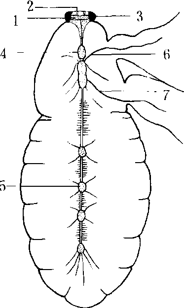 壁处。幼虫中枢神经有13对神经节,其中头部2对、胸部3对、腹部8对。成虫中枢神经在头部和胸部的神经节与幼虫相似,其特点是,第1对神经节即脑特别发达,咽侧神经索缩短,因而第2对神经节距离很近,中间仅有一小孔通过食道和背血管。成虫胸部第1神经节接近第2神经节,而第2、第3神经节又相互紧密结合成瓢形(图1)。 外周神经 由中枢神经系统发向蚕体周缘各器官组织的神经,包括由神经节到反应器的传出神经和由感受器到中怄的传入神经。 幼虫外周神经幼虫头部外周神经由脑的两侧各分出4条神经。其中除位于内侧的1对伸向脑的前方与额神经节相连的额神经外,其余3对分别伸向上唇、触角和单眼,相应称为上唇神经、触角神经和视觉神经。咽下神经节的前端左右各分出3条神经,分别分布于下腭、上腭和下唇; 在咽下神经节后端两侧各分出1条神经,向后延伸至第1胸节,分布在背血管的两侧。胸腹部的外周神经,除最后神经节外,各神经节的前后两端各向左右伸出两条神经,分布在背肌和体壁及腹肌的内层; 后端分出的神经分布到腹肌的外层及跗肢。最后神经节是复合神经节,后部从两侧发出3对神经。 成虫外周神经 成虫由脑分出的3对外周神经,分别分布至复眼、触角和上唇。从第2神经节向前发出的3对神经,分布到口器的上腭、下腭和下唇。胸部各神经节的前后两端各发出1对神经,分别分布到各自环节的足和翅。腹部第1神经节与胸部第3神经节之间的神经索,发出2对神经,分布在腹部第1、2环节中。从腹部第1、2、3神经节各发出2对神经,分布在各环节的背肌和腹肌上。腹部第4神经节发出的神经分布在腹部第6及以后环节的肌肉和生殖器上(图2)。