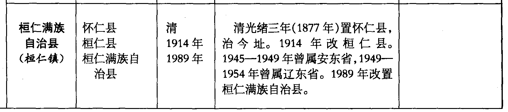 桓仁满族自治县(桓仁镇)怀仁县桓仁县桓仁满族自治县清1914年1989年清光绪三年(1877年)置怀仁县,治今址。1914年改桓仁县。1945—1949年曾属安东省,1949—1954年曾属辽东省。1989年改置桓仁满族自治县。