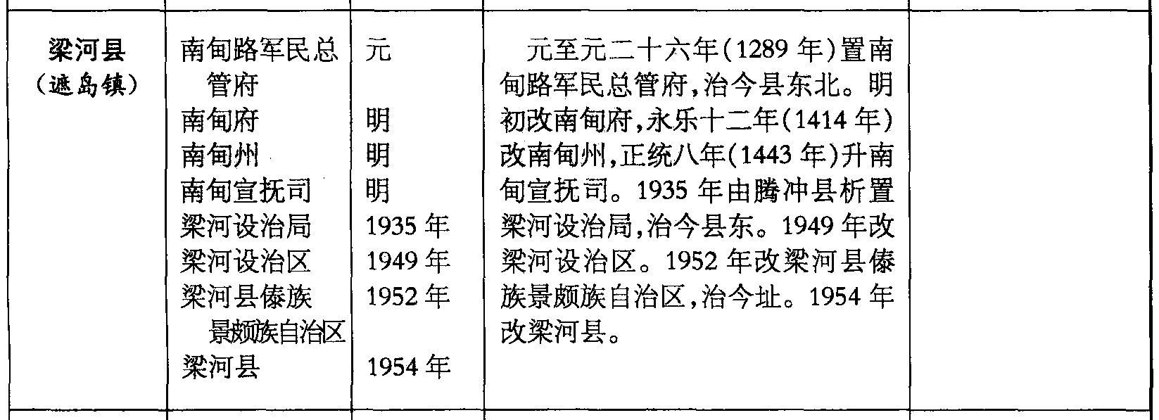 元至元二十六年(1289年)置南甸路军民总管府,治今县东北。明初改南甸府,永乐十二年(1414年)改南甸州,正统八年(1443年)升南甸宣抚司。1935年由腾冲县析置梁河设治局,治今县东。1949年改梁河设治区。1952年改梁河县傣族景颇族自治区,治今址。1954年改梁河县。