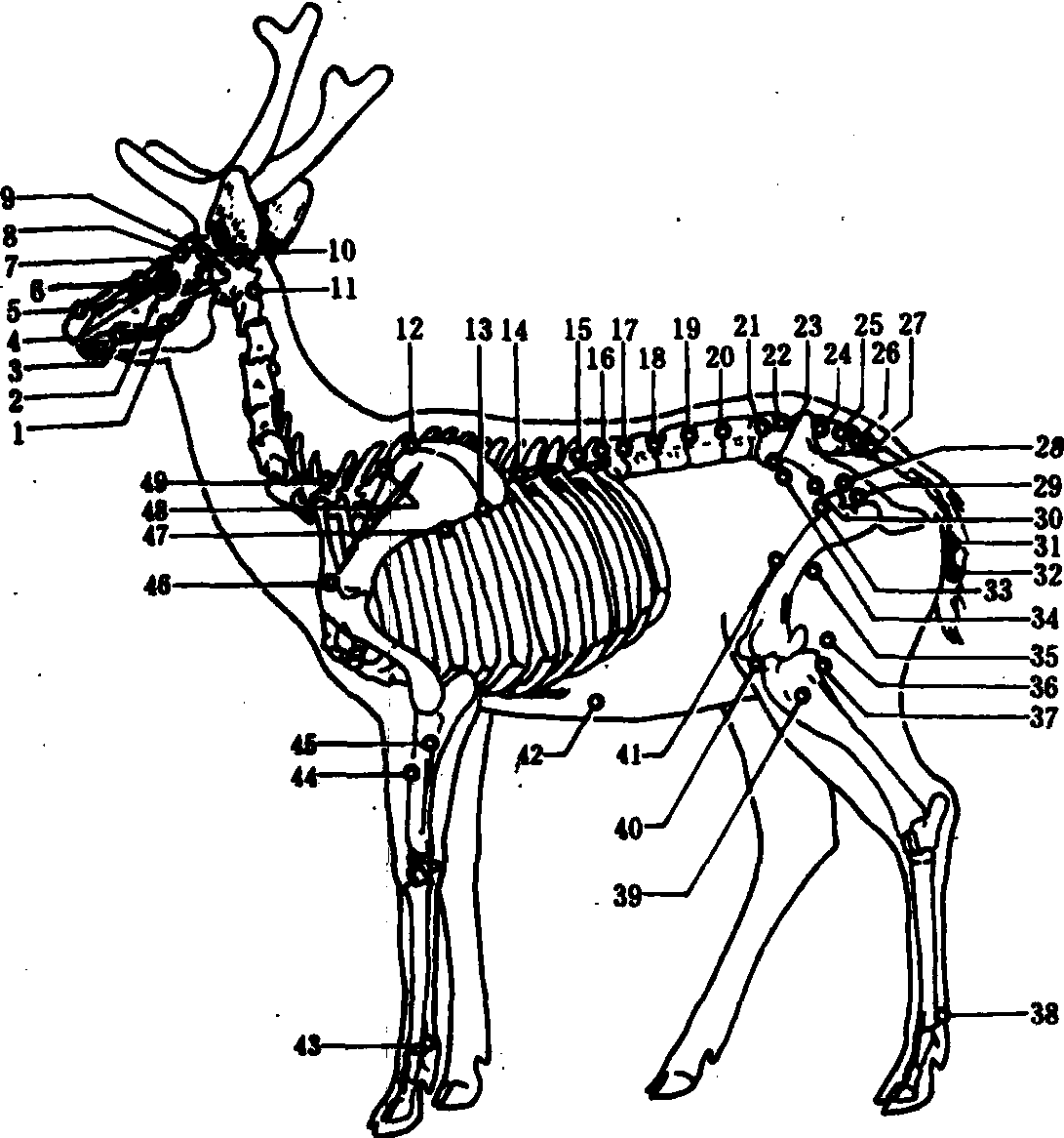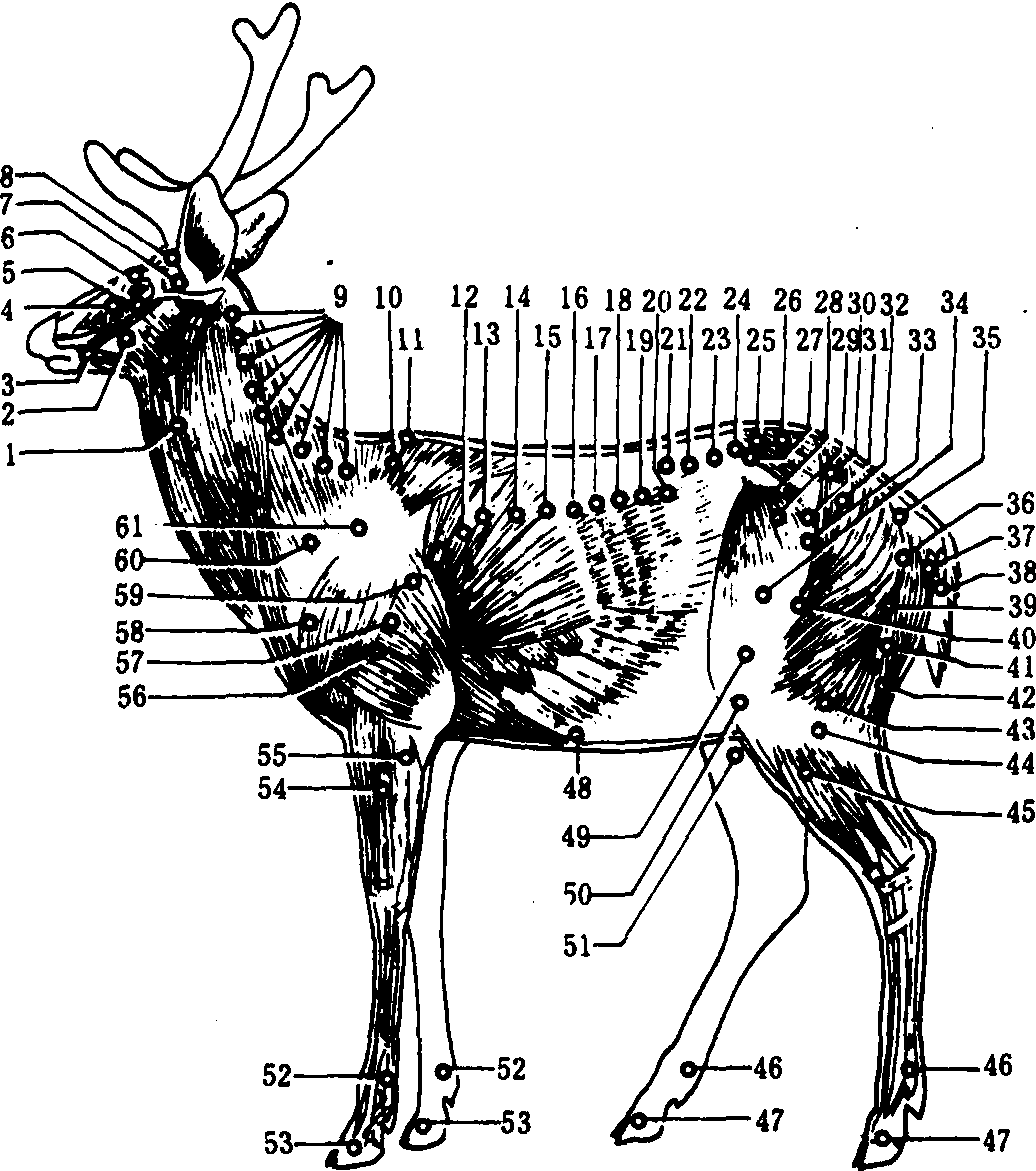 释义 | 梅花鹿腧穴acupoints of deer对梅花鹿行针施灸治病的刺激点。见《中国针灸荟萃·兽医针灸卷》。参照牛、马穴位,穴位电阻测定及临证实践所定取。常用穴位共77个,其中头部14个、躯干部29个、前肢12个、后肢22个(图1~2)。 图 1 梅花鹿肌肉及穴位 膊尖(bojian) 肩胛软骨与肩胛骨前角结合处,左右侧各一穴。圆利针沿肩胛骨内缘向后下方刺入3~5厘米。主治闪伤跛行、前肢风湿。 膊栏(bolan) 肩胛软骨与肩胛后角结合处,左右侧各一穴。圆利针沿肩胛骨内侧向肩峰方向斜刺3~5厘米。主治闪伤跛行、前肢风湿。 肺门(feimen) 肩胛骨前缘, 膊尖穴下方7厘米处,左右侧各一穴。圆利针向肘突方向刺入3~5厘米。主治前肢风湿、肩胛上神经麻痹。 肺攀(feipan) 肩胛骨后缘, 膊栏穴下方7厘米处,左右侧各一穴。圆利针向肩峰方向斜刺3~5厘米。主治前肢风湿、肩胛上神经麻痹。 抢风(qiangfeng) 肩关节后方,三角肌后缘, 臂三头肌长头与外头之间的凹陷中, 左右侧各一穴。圆利针直刺3~5厘米。主治闪伤、前肢风湿。 冲天(chongtian) 抢风穴后上方约4厘米,三角肌与臂三头肌长头之间的凹陷处,左右侧各一穴。圆利针直刺3~5厘米。主治前肢风湿、关节肿痛。 胸堂(xiongtang) 胸前两侧,桡骨上端水平位处的臂皮下静脉上,左右侧各一穴。中宽针沿血管刺入0.5厘米,出血。主治肩肘关节肿痛、中暑。 肩井(jianjing) 肩关节外侧,臂骨大结节上缘, 肩峰直下方的凹陷处, 左右侧各一穴。圆利针向内下方斜刺约3厘米。主治前肢风湿病、肩关节肿痛。 乘重(chengzhong) 桡骨外侧韧带结节下方2厘米的前臂外侧沟内, 左右肢各一穴。圆利针直刺约3厘米。主治前肢风湿病、肘腕关节肿痛。 前三里(qiansanli) 乘重穴下方4厘米的桡沟内,左右肢各一穴。圆利针直刺约3厘米。主治前肢风湿病、肘腕关节肿痛。 缠腕(chanwan) 球节部, 掌(跖)骨下端的指(趾)内外侧静脉上, 每肢二穴, 共八穴。小宽针点刺放血。主治球节扭伤、蹄头肿痛。 蹄头(titou) 蹄冠上缘背侧向远轴侧旁开1厘米处, 每肢二穴, 共八穴。小宽针点刺放血。主治中暑、感冒、蹄头肿痛。 鬐甲(qijia) 第四胸椎棘突前缘的背中线上, 一穴。圆利针斜向前下方刺入约10厘米。主治气喘、感冒。 大椎(dazhui) 颈基正中, 冈上肌前缘4厘米,左右侧各一穴。圆利针直刺约10厘米。主治感冒、中暑。 断血(duanxue) 第十二与第十三胸椎、第十三与第一腰椎、第一与第二腰椎棘突之间的凹陷处各一穴, 共三穴, 依次为断血一、断血二、断血三。圆利针直刺约4厘米。主治尿血、便血。 命门(mingmen) 第二与第三腰椎棘突之间凹陷处, 一穴。圆利针直刺约4厘米。主治尿闭、肾炎、风湿症。 安肾(anshen) 第三与第四腰椎棘突之间的凹陷处, 一穴。圆利针直刺约4厘米。主治尿闭、肾炎、风湿症。 阳关(yangguan) 第四与第五腰椎棘突之间的凹陷处,一穴。圆利针直刺约4厘米。主治腰胯风湿病。 大肠俞(dachangshu) 倒数第一肋间的髂肋肌沟内,左右侧各一穴。圆利针直刺约3厘米。主治消化不良、肠黄、臌气。 胃俞(weishu) 倒数第二肋间的髂肋肌沟内,左右侧各一穴。圆利针直刺约3厘米。主治消化不良、肠黄。 脾俞(pishu) 倒数第三肋间的髂肋肌沟内,左右侧各一穴。圆利针直刺约3厘米。主治消化不良、瘤胃积食、臌气。 肝俞(ganshu) 倒数第四肋间的髂肋肌沟内,左右侧各一穴,圆利针直刺约3厘米。主治眼病、黄疸。 肺俞(feishu) 倒数第五肋间的髂肋肌沟内,左右侧各一穴。圆利针直刺约3厘米。主治咳嗽、气喘。 图2 梅花鹿骨胳及穴位 关元俞(guanyuanshu) 第十三肋骨后缘的髂肋肌沟内,左右侧各一穴。圆利针直刺约3厘米。主治瘤胃积食、前胃弛缓。 小肠俞(xiaochangshu) 第一、二腰椎横突顶端向外延长线之间的髂肋肌沟内,左右侧各一穴。圆利针直刺约3厘米。主治消化不良、腹泻、臌气。 膀胱俞(pangguangshu) 第二、三腰椎横突游离端向外延长线之间的髂肋肌沟内,左右侧各一穴。圆利针直刺约3厘米。主治尿闭、肾炎。 滴明(diming) 乳井后缘,剑状软骨游离端后方4厘米,腹白线垂直旁开4厘米的腹皮下静脉上,左右侧各一穴。中宽针点刺放血。主治尿闭、臌气。 夹脊(jiaji) 胸腰部背中线两侧平行排列的两行梅花斑上,从第一胸椎到最后腰椎棘突旁开2厘米,每一椎骨后缘显示一对穴位。左右侧各19穴,共19对。圆利针直刺5~10厘米。主治背腰风湿病。 百会(baihui) 最后腰椎与第一荐椎棘突之间的凹陷处,一穴。圆利针直刺约5厘米。主治腰胯闪伤、背腰风湿病、后躯麻痹。 肾俞(shenshu) 百会穴旁开4厘米,左右侧各一穴。圆利针直刺约4厘米。主治腰胯风湿、腰背闪伤。 肾棚(shenpeng) 肾俞穴前方约4厘米,距背中线4厘米处,左右侧各一穴。圆利针直刺约6厘米。主治腰胯闪伤、腰胯风湿症。 腰后(yaohou) 肾棚穴前方约4厘米,距背中线4厘米处,左右侧各一穴。圆利针直刺约6厘米。主治腰部风湿。 腰中(yaozhong) 腰后穴前方4厘米,距背中线4厘米处,左右侧各一穴。圆利针直刺约6厘米。主治腰部风湿。 腰前(yaoqian) 腰中穴前方4厘米,距背中线4厘米处,圆利针直刺6厘米。主治腰部风湿。 肾角(shenjiiao) 位于肾俞穴后方4厘米,距背中线4厘米,左右侧各一穴。圆利针直刺约5厘米。主治腰胯风湿病、腰胯闪伤。 八窖(bajiao) 荐椎棘突间外侧2厘米,左右侧各四穴,共八穴,故名八窖(从前向后,依次为上窖、次窖、中窖、