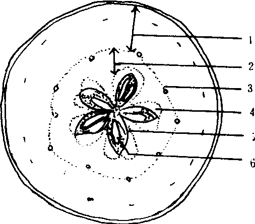 1.花托的皮层部 2.花托的髓部 3.果心线