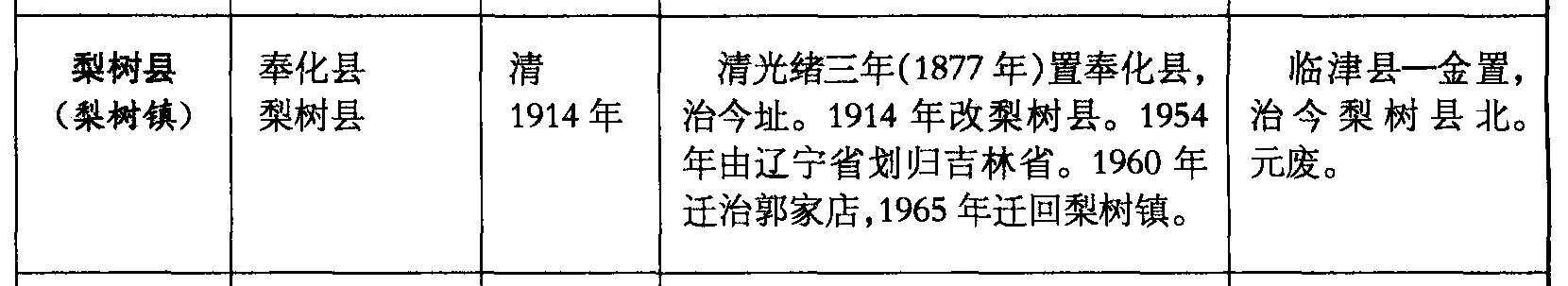 梨树县(梨树镇)奉化县梨树县清1914年清光绪三年(1877年)置奉化县,治今址。1914年改梨树县。1954年由辽宁省划归吉林省。1960年迁治郭家店,1965年迁回梨树镇。临津县—金置,治今梨树县北。元废。