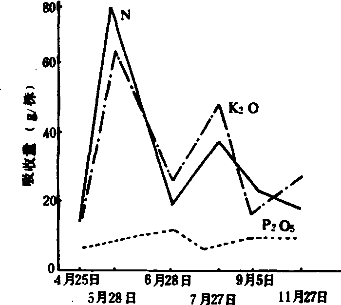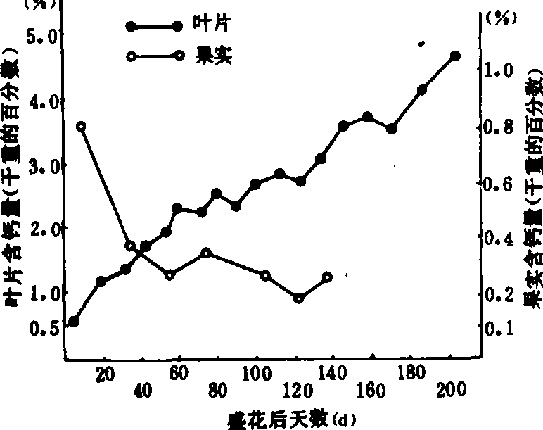 钙素(Ca) 年生长周期中,梨树叶片的含钙量,由春季展叶至秋季落叶呈逐渐增加的趋势;果实含钙量,由坐果至采收其绝对量不减,而相对浓度由大至小(图2)。尤其在盛花后,10~30天内,果实钙的浓度含量下降最快,果实生长的整个时期中,钙均能进入果实(中后期进入仍较多,这与苹果很不同),鸭梨果实90%的钙是盛花后60~140天进入的;然而由于最后梨果实干物质的增加高于进入的钙量,因此果实中钙的浓度并未上升。梨树缺钙时易引起苜蓿青、黑底、木栓斑等生理病害。 图2 鸭梨叶片和果实中Ca含量的变化 铁素(Fe) 石灰性土壤、滩涂盐碱沙荒地,梨树缺铁黄叶病相当普遍,即春季发芽晚,开花迟,新梢先端幼叶的叶脉绿色而叶肉全部黄色甚至白色,叶绿干枯,并呈“梢枯”。缺铁树生长势衰弱,严重时死亡。缺铁病因,不是土壤中全铁量低,而是土壤活性铁含量低。土壤活性铁含量与叶片叶绿素含量呈高度正相关。 硼素(B) 梨树的花芽,叶芽和幼果的发育都需要硼。缺硼时,春季花芽膨大或开绽期停止发育,芽的鳞片松散,里面的花器干缩;叶芽开绽期,新梢顶端叶芽开始干枯,其下部休眠芽陆续萌发,呈花序状,之后亦逐渐干枯,坐果率极低,生长不正常,果个小,果肉不均匀地木栓化,果面有凹陷,皱缩,果实畸形。 施肥技术 施肥时期 秋季有机肥作基肥,有利于根系吸收后作为贮藏营养以提供翌年春季萌芽开花和坐果之用,具体时间以断根后还能发出新根而地上部不再引起新梢的生长为宜。对生长特别旺盛的树,可以在早春作基肥施用,以减弱新梢生长势,促使幼树早结果。追肥的时期,氮肥宜在生长季前期,如辽宁锦西一带山区秋白梨,在同等施氮量(每100立方米冠积施氮2.25~2.50千克)条件下,两次追施比一次追施的增产效果好,这两次的时间是春季芽萌动期和初夏生理落果后,10年平均产量比不追施氮肥的增产39.0%。比其他时期追施一次肥的增产16.8%~20.8%,比生长季后期两次追施氮肥的增产11.2%(表1)。追施磷、钾肥的时期,以生理落果期到花芽分化开始期较好。硼、铁、钙的追施也以早期较好。