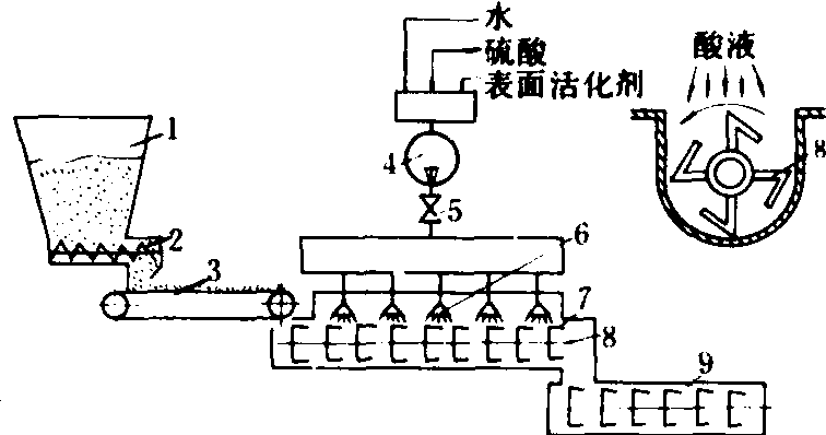 释义 | 棉籽硫酸脱绒设备cotton seed delinter by sulphuric acid用硫酸除去棉籽表面短绒的设备。美国19世纪就有化学脱绒工艺,开始采用干盐酸和浓硫酸脱绒,同时研制出了浓硫酸脱绒设备。20世纪70年代后期,出现了较先进的稀硫酸脱绒设备,其后更先进的泡沫酸脱绒设备又相继问世。中国曾有手工和简易设备进行棉籽硫酸脱绒,20世纪80年代初出现较完善的浓硫酸脱绒设备,并引进稀硫酸脱绒和泡沫酸设备,80年代中期研制出泡沫酸脱绒设备。 计量式棉籽稀硫酸脱绒设备示意图 1.喂料斗;2.螺旋推运器;3.输送带; 4.稀硫酸泵;5.阀门;6.喷头; 7.稀硫酸处理罐; 8.弯头杆式搅拌器;9.混合器 泡沫酸脱绒设备 以起泡的硫酸为棉籽脱绒剂。首先使棉籽迅速通过火焰烧绒器(温度500℃,通过时间1.5秒),烧去棉籽表面的长绒和残屑,经振动筛清除大杂物与碎屑,进入泡沫酸处理罐。浓硫酸、水、起泡剂经泡沫发生器使混合液起泡,撒注在酸处理罐内的棉籽上。起泡的硫酸是一种多孔物质,每个气孔壁都很薄,并含有均匀分布的硫酸,当棉籽与起泡酸混合,并受到处理罐内搅拌器的搅拌时,气泡破裂,棉籽短绒与泡沫酸接触面增大,由于泡沫酸的毛细管作用,促使其向棉籽的短绒渗透。酸处理后的棉籽进入两台结构相同的转筒干燥机,旋转转筒内部设有组合隔板,棉籽在干燥过程中表面水分蒸发,硫酸浓度增大,使短绒脆化;棉籽经组合隔板与热气流的推移和翻动,使短绒脱落,最后在中和器中用氨气中和残余硫酸,完成清选和拌药等工序,得到优质脱绒棉籽。 泡沫酸脱绒是计量式稀硫酸脱绒的发展,加入起泡剂使硫酸起泡后覆盖于棉籽表面,对棉籽作用柔和,化学渗透最小,具有稀硫酸脱绒的优点,又克服了烘干耗能大的缺点,因而是很有发展前途的脱绒方法。 |