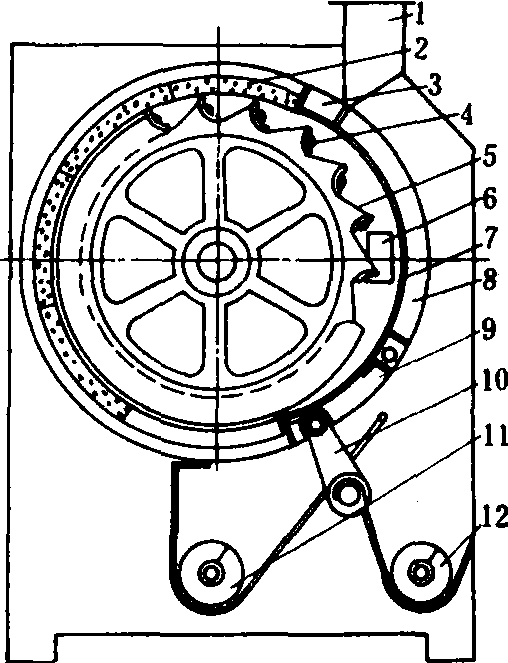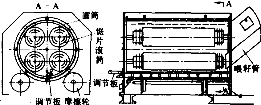 释义 | 棉籽脱绒机cotton seed delinter用机械方法脱去棉籽上短绒的机器。按脱绒部件的不同可分为皮辊式、锯齿式、砂瓦(磨料)式、磨盘式、钢片式、角钉式等多种类型。生产上应用较多的是锯齿脱绒机,有毛刷式、气流式和圆筒式等型式。 图1 圆筒式锯齿脱绒机 磨料式脱绒机 由若干块金刚砂组成的砂瓦工作面和拨籽叶片辊筒组成(图2)。在辐筒离心力和叶片推动下,棉籽紧贴金刚砂磨料的弧形表面移动,被金刚砂粒的边棱把短绒脱下,由气流吸绒道送至集绒装置,杂质坠落于排杂螺旋输送器排出机外,棉籽由出籽口排出。磨料脱绒机结构简单,维修方便,安全性能和劳动环境好;生产效率同锯齿剥绒机相近。但不能分道脱绒,脱出的头道短绒长度偏短,二、三道绒的长度也不易准确掌握,排出的棉籽光毛程度不够均匀。 图2 磨料式脱绒机 1.吸绒道; 2.砂瓦; 3.连接盖板;4.叶片; 5.拨籽辊; 6.喂籽口; 7.筛网; 8.筛网架; 9.开箱架; 10.走动架; 11.排籽螺旋; 12.排杂螺旋 现代脱绒机朝着棉卷密度自动控制,工作厢液压操纵,大工作厢,大直径锯片,以及改变锯齿齿形等方向发展,这对提高单机的生产效率,自动化程度,产品质量,改善工人劳动强度和生产条件以及环境保护有其重大的意义。 |