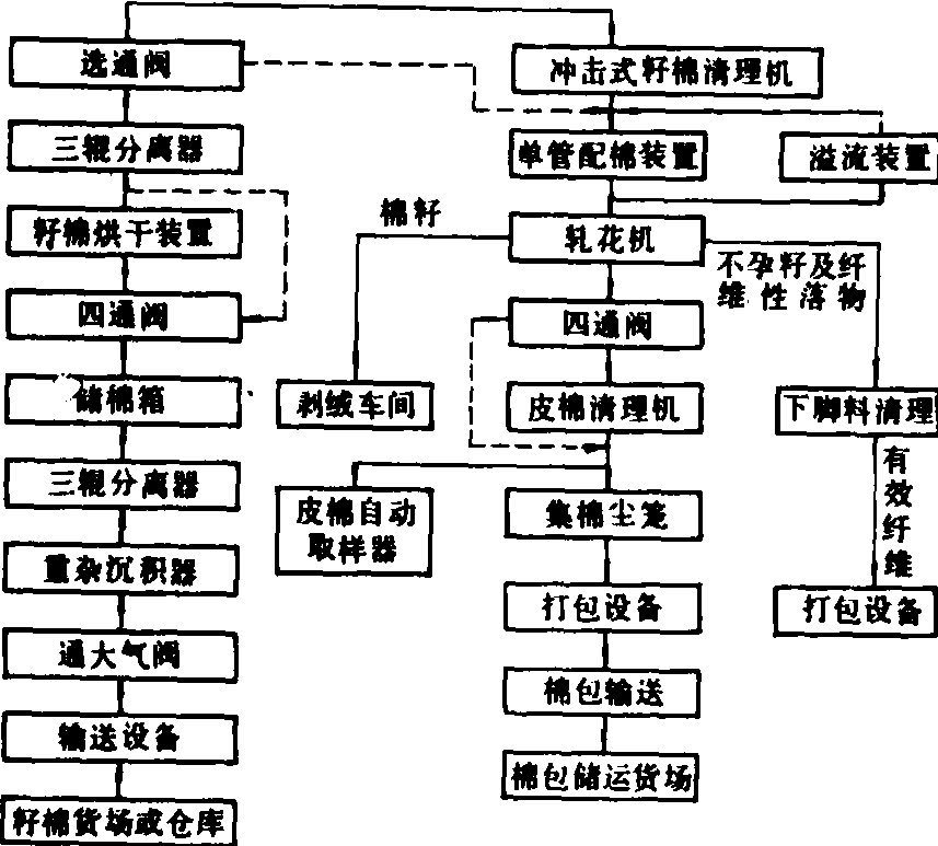 中国轧花工艺流程框图 经过机械轧花后的棉籽,表面残留着短绒,其重量约为皮棉重量的15%。脱下的短绒是纺织、军工、化工等方面的重要原料。而且,用带绒棉籽作种子,不利于精选分级,影响种子发芽和机械播种质量,短绒也容易带病菌;用带绒棉籽榨油,短绒也会吸收一部分油脂或沾附棉仁,减少棉籽出油率,棉籽脱绒后每100千克约可多出油0.75千克,油质也比较纯净。 棉籽脱绒有机械脱绒法(见棉籽脱绒机)和化学脱绒法两种。化学脱绒法主要使用盐酸蒸气或硫酸,以硫酸脱绒(见棉籽硫酸脱绒设备)效果较好,应用也广。 主要设备 包括:清棉机、籽棉干燥设备、轧花机、棉籽脱绒设备、皮棉打包机等。此外,还包括棉花下脚料回收利用、物料输送、通风除尘、安全防火等辅助设备。棉花加工机械cotton processing machinery完成籽棉加工成纤维、短绒和棉籽所使用的初加工机械。按加工工艺流程,棉花加工机械包括:烘干、清理、轧花、剥绒、打包、输送、除尘等各个环节、各种不同类型的机械与设备。 |