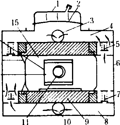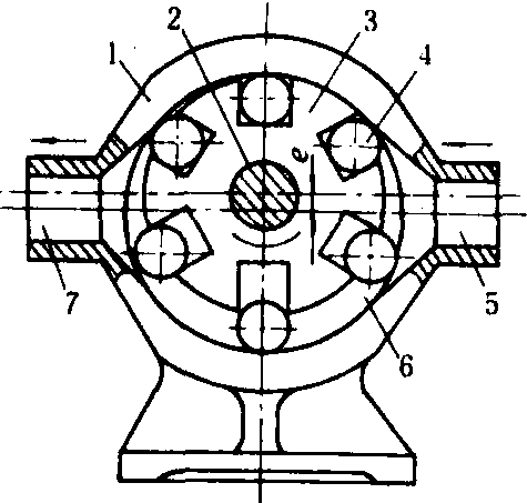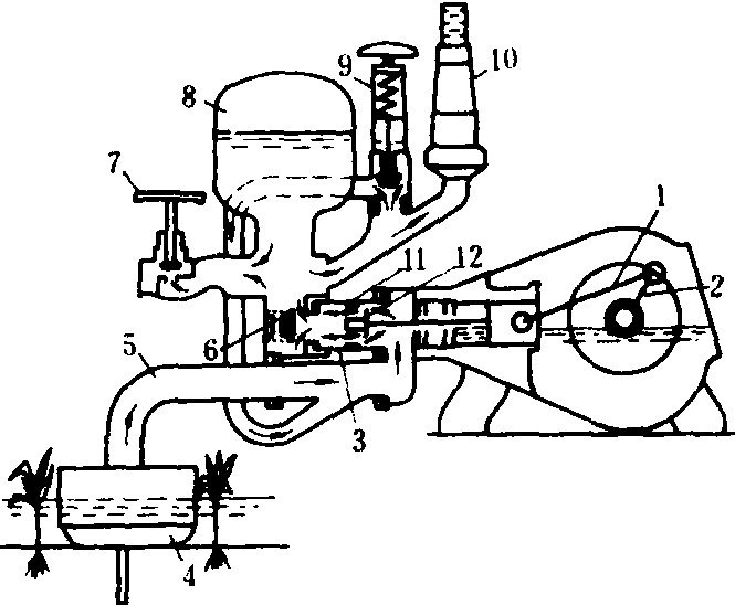 活塞泵 主要由活塞、泵缸、进液阀、出液阀、空气室、曲柄和连杆等组成。由活塞上的挠性件(皮碗或橡胶碗)保持活塞与泵缸之间的密封性。其工作原理如图1所示。当活塞由右极限位置向左移动时,进液阀关闭,活塞左侧泵缸的空间逐渐减小,缸内的药液受压而使压力升高。药液经出液阀流入空气室和出液截止阀,并由喷雾软管排出。在活塞向左移动的同时,活塞右侧泵缸空间逐渐扩大而形成低压,使药液通过吸液滤网和进液管进入泵缸右端。当活塞由左极限位置向右移动时,出液阀关闭,进液阀打开,活塞右侧药液通过进液阀流到泵缸的左侧,原来进入空气室的一部分液体继续向外排出。当活塞再次自右向左移动时,就重复排液和吸液的过程。调压阀用以调节排液压力。当该压力超过允许值时,部分药液通过调压阀流回到进液管路中去。 活塞泵在中、小型喷雾机中使用较多,有单缸、双缸和三缸等型式。单缸泵多用于手动喷雾器;双缸和三缸泵多用于机动喷雾机。往复容积泵需有安全阀和调压阀与其配套使用。此泵具有自吸能力,工作压力较高而流量较小。 图1 活塞泵工作原理图 1.连杆;2.曲柄;3.泵缸;4.吸液滤网;5.进液管;6.出液阀;7.出液截止阀;8.空气室;9.调压阀;10.压力指示器;11.活塞;12.进液阀 活塞泵的阀门分为平阀、锥阀和球阀三种。球阀中圆球的支承面较窄,易与阀门座紧密配合,工作可靠,在手动往复泵上采用较多;机动往复泵转速较高,常采用弹簧顶压平阀门。活塞泵的气室是为了稳定工作压力和减少管路系统的振动,常装在出水室附近,常用空气室有空腔式和隔膜式。空腔式是一个具有一定空间的耐压容器,在压力药液进入后,可使其存贮在上部的空气受到压缩,具有稳压作用。隔膜式则是在空气室的中部装有弹性隔膜,将空气室分成上、下两部分,上半部注入规定压力的压缩空气,起到稳压作用,并可相应缩小空气室的容积。这种结构,由于空气与药液隔离,不会发生空气逐渐溶入药液的现象,可保持空气量的稳定。随着转速的不断提高,液泵每一行程排液量相对减小。此类泵有取消空气室的趋向。压力指示器是用来指示液泵排出药液压力的大小,是一种常规压力表的代用装置,在工作中不易失效,但存在指示压力不够精确的缺点。 柱塞泵 主要由柱塞、泵缸、进出液阀门和空气室等组成。柱塞和泵缸之间采用密封圈或填料保持其密封性。其工作原理与活塞泵相同。显著的优点是可方便地在外部调节填料的压紧状态,以消除柱塞处的泄漏。20世纪80年代,有些国家在植保机械用液泵上采用工业陶瓷做柱塞和进排液阀,大大提高了柱塞泵(还包括活塞泵)的性能,使泵转速由800~1000转/分,提高到1 500~1 800转/分;进出液阀门采用组合式阀门,使泵结构紧凑,寿命达2000小时左右;密封件采用氟橡胶和弹簧预紧结构,提高了泵性能的稳定性和可靠性。 活塞隔膜泵 主要由活塞、隔膜、泵缸、进出液阀门和空气室等组成。与活塞泵、柱塞泵结构的主要区别是在活塞外面放一个橡胶隔膜把活塞与药液隔开,使活塞浸在润滑油内运动,不易磨损。两缸双作用活塞隔膜泵的工作原理如图2所示。当活塞在泵缸内向右移动时,隔膜也随之右移,其工作原理与活塞泵相同。与活、柱塞泵相比,活塞隔膜泵的结构较简单;其活塞不接触药液,不受药液的腐蚀,磨损较小。 图2 两缸活塞隔膜泵工作原理图 1.空气室; 2.气室隔膜; 3.出液口; 4.出液道; 5.出液阀; 6.泵盖; 7.进液阀; 8.进液道; 9.泵体; 10.进液口; 11.偏心轴; 12.滑块; 13.活塞隔膜; 14.抗磨片;15.活塞 20世纪70年代大多数欧美国家喷雾机已配用此类型泵;80年代初中国开始生产,并有系列产品。需安装安全阀、调压阀和空气室等部件,并具有自吸能力。由于隔膜的存在,泵的容积效率随吸水高度的增加而减小,故要求泵的安装尽量靠近水源。隔膜是该泵的主要易损件,按其与活塞的连接方式,可分为强制式和非强制式隔膜两种。隔膜的寿命较短,一般在500小时左右。由于隔膜强度原因,常用工作压力比同级活、柱塞泵略低。泵有单缸、双缸和多缸,单缸多用于手动喷雾器。两缸以上常用于机动喷雾机。 滚子泵 主要由转子、泵体和滚柱等组成(图3)。转子是径向开有4~8个槽的圆柱体,每个槽内装一个直径等于槽宽的滚子,转子与泵体内壳有一个偏心距,当转子高速旋转时,滚子在离心力作用下,紧贴着泵体内壳表面,并与泵体、转子和泵盖组成密闭工作室,该室容积大小随转子转角不同而变化。当容积由小变大时,工作室形成低压区将药液吸入;当容积由大变小时,将药液压出。 1.泵体; 2.轴; 3.转子; 4.滚子;5.进液口; 6.工作室; 7.出液口 滚子泵体积较小,结构简单,能适应拖拉机动力输出轴转速,排量在转速稳定时是均匀的,随着压力的增高,泄漏量增加,泵的排量及容积效率也随之降低。其率;b为转子宽度(分米);e为偏心距(分米);n为转子转速(转/分);Z为滚子数;r为滚子半径(分米);R为滚子室半径(分米);η 为容积效率(一般为0.9)。滚子泵需要安装安全阀和调压阀,有自吸能力。 有些国家的产品在泵体和泵盖内侧电镀耐磨材料或抗腐蚀的高镍合金,滚子用聚丙烯、尼龙、特氟隆和丁腈橡胶,密封件用氟橡胶等材料,使泵的性能稳定性和寿命都有提高。 离心泵 主要由叶轮、泵体和泵轴等组成。泵轴端固定叶轮,轴与泵体之间的间隙是用密封圈和填料来保持密封性的