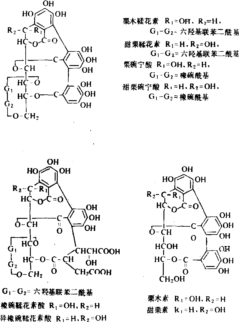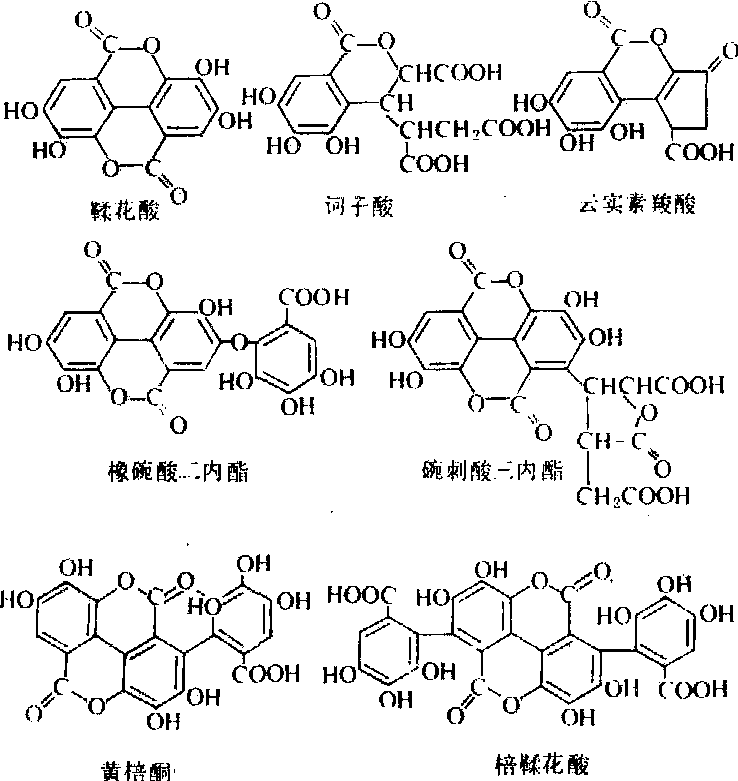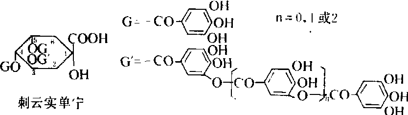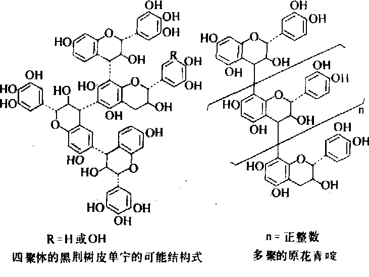 释义 | 植物单宁vegetable tannin树皮、树叶、木材和果壳等植物原料中所含的能鞣皮成革的物质。又称单宁或植物鞣质。单宁能鞣皮成革的原因是:单宁分子具有较多的酚羟基,能与多肽形成多点结合;分子量500~3000,能进入胶原纤维的内部空间,在相邻的多肽链间产生交联结构。 五倍子单宁含于五倍子内,为中国特产。国际上称为中国棓子单宁。平均由一个分子葡萄糖与8~9个没食子酸结合成酯。五倍子单宁(结构式右上)可被分离为许多化学结构明确的、不同的多没食子酰葡萄糖。每个多没食子酰葡萄糖分子内的没食子酰基个数自5个到12个以上,多数为7到11个,均以β-1,2,3,4,6-五-O-没食子酰-D-葡萄糖分子为核心,在核心的2、3或4位上的没食子酰基以缩酚酸的形式与更多的没食子酰相连接,但连接的位置与个数各不相同。 土耳其棓子单宁含于染色栎棓子内,也是多没食子酰葡萄糖的混合物,平均由一个分子葡萄糖与5~6个没食子酸结合成酯。每个分子内的没食子酰基个数自3到9不等,多数为5到6个。分子结构式的核心部分有两种类型:一种以β-1,2,3,6-四-O-没食子酰葡萄糖为核心;另一种以β-1,2,3,4,6-五-O-没食子酰葡萄糖为核心。其余的没食子酰基以缩酚酸的形式与核心相连,但位置及个数各不相同。 刺云实单宁含于刺云实的豆荚内,是没食子酸与奎尼酸形成的酯,在3位上有缩酚酸链(结构式如下)。 鞣花单宁 由六羟基联苯二酸或其他与没食子酸有生源关系的多元酚羧酸与多元醇(主要是葡萄糖)结合成的酯。水解后产生多元醇和酚羧酸如鞣花酸、诃子酸、云实素羧酸、橡碗酸二内酯、碗刺酸三内酯、黄棓酮酸、棓鞣花酸等(结构式如下)。鞣花单宁的种类繁多,制革业常用的鞣花单宁来自橡碗、栗木、诃子等。 橡碗单宁主要由栗木鞣花素、甜栗鞣花素、栗碗宁酸、甜栗碗宁酸、橡碗鞣花素酸、异橡碗鞣花素酸及甜栗素等组成。栗木单宁及栎木单宁主要由栗木素、甜栗素、栗木鞣花素、甜栗鞣花素组成(结构式如下)。诃子单宁主要由诃黎勒酸、诃黎勒鞣花酸、诃子素、鞣料云实素及几种多没食子酰葡萄糖组成。 缩合类单宁 具有鞣制能力的多聚原花色素。原花色素是植物体内的一种在酸/醇作用下能产生花色素的天然有机物。原花色素分子内芳香环之间通过C—C链相连,在水溶液中用酸处理时缩合成为不溶于水的沉淀。 多聚原花色素分子的组成单元是黄烷醇。黄烷醇具有C6·C3·C6型结构,即两个芳香环A、B之间以3个脂族碳原子相连。根据A、B环上羟基取代情况的不同而有不同的名称,例如C-7上有OH的(间苯二酚型A环)原花色素有原菲瑟啶、原刺槐啶等,C-5、C-7位上有OH(间苯三酚型A环)的原花色素有原花青啶、原翠雀啶等。在酸/醇作用下,原菲瑟啶、原刺槐啶、原花青啶及原翠雀啶产生的花色素分别是菲瑟啶、刺槐啶、花青啶及翠雀啶(结构式如上图)。混合型的原花色素如原花青啶—原翠雀啶则产生花青啶与翠雀啶。 多聚原花色素是复杂的混合物,多聚体的分子结构特征源于:组成单元的羟基取代和杂环构型不同,组成单元的连接位置、组合顺序及个数不同。这些聚合度不同结构上十分相似的多聚原花色素共存在一起,极难分离为结构式单一的纯体。 㭴木单宁主要组分是多聚原菲瑟啶,平均分子量为1780,相当于六聚体。黑荆树皮单宁由多聚原刺槐啶及少量原菲瑟啶组成,平均分子量1250,相当于四聚体(结构式如下),具支链型聚合物结构。落叶松树皮、木麻黄树皮、山槐树皮内的单宁为多聚原花青啶(结构式如下),毛杨梅树皮单宁为多聚原翠雀啶,部分组成单元内连有没食子酰基。槲树皮及油柑树皮单宁由原翠雀啶与原花青啶组成,部分组成单元内也连有没食子酰基。 理化性质 单宁通常为非晶形固体,溶于水,也溶于或部分溶于丙酮、甲醇、乙醇、乙酸乙酯。不溶于乙醚、石油醚、氯仿、二硫化碳、苯等溶剂。单宁味苦涩,有收敛性。水溶液呈弱酸性,在碱性溶液中易氧化,使颜色变深。与明胶、生物碱产生沉淀。遇三价铁离子显蓝色或绿色。单宁在胶体溶液内以胶团形式存在。单宁胶粒带负电,有负的动电电位。向栲胶溶液中加入食盐,一部分单宁聚集而被盐析出,用分级盐析法可将大小不同的单宁分开。 水解类单宁在酸、碱、酶作用下,容易水解。五倍子单宁与橡碗单宁在水溶液中,甚至在常温条件下发生水解,前者产生没食子酸,后者产生鞣花酸(黄粉)。缩合类单宁在水溶液中不被水解,在酸性溶液中缩合产生红粉。在酸—醇溶液内能被降解,在有硫醇或间苯三酚等亲核试剂存在的条件下,多聚原花色素分子中的延伸单元形成硫醚或间苯三酚的加成物,终端单元则被游离出来。这是缩合单宁最重要的化学反应。 在碱性或有氧化酶存在条件下,单宁氧化很快。如单宁溶液pH值在2.5以下,溶液中有亚硫酸氢钠或二氧化硫存在时,单宁的氧化停止。 在鞣制过程中,单宁的酚羟基与胶原的肽基间通过多点氢键结合、产生交联而使生皮成革。 单宁为多基配位体,能与多种金属络合,在钢板表面产生单宁络合物薄膜,抑制金属腐蚀,有时作为防蚀防锈剂的配方材料。 缩合类单宁与亚硫酸盐的反应有重要的实用意义,可使单宁的水溶性增加,粘度降低,颜色浅化。亚硫酸氢钠与具有间苯二酚型A环的单宁(如黑荆树皮单宁)反应时,磺酸盐根进入被打开了杂环的C2碳原子上。与具有间苯三