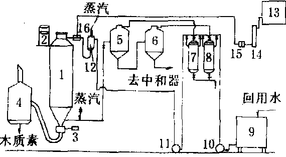 图2 70立方米容积水解器 1.钢壳体; 2.水泥层; 3.耐温耐酸板; 4.耐温耐酸砖;5.保温层; 6.水平渗滤采液延伸管; 7.垂直渗滤采液短管; 8.木质素排出阀; 9.重量计; 10.人孔; 11.水平渗滤水酸进入管(经混合器); 12.进酸管接头; 13. 进水管接头; 14.原料料位指示器;15.自动关启式上盖 国际上采用渗滤法水解生产的企业为了全面利用原料中的聚己糖及聚戊糖,依所选定产品方案的不同主要有4种类型的水解厂:❶酵母水解厂; ❷酒精酵母水解厂(酒精为主产品); ❸糠醛酵母水解厂(糠醛为主产品); ❹木糖醇酵母水解厂(木糖醇为主产品)。酒精酵母水解厂基本生产流程见图3。 通过渗滤法水解,每吨绝干原料(按针叶树材计)可获得450~500千克左右的还原糖。今以酒精酵母水解厂及酵母水解厂为例,其产品(包括副产品)及数量见下表。两种水解厂产品及数量 产品及副产品 | 酒精酵母水解厂 | 酵母水解厂 | 酒精(按无水计,升) | 175~182 | - | 饲料酵母(10%水分,千克) 甲醇(千克) | 32 2.0 | 225~235 2.0 | 杂醇油(千克) | 0.3 | - | 粗糠醛(94%,千克) 木质素(按绝干计,千克) | 5.6 380 | 5.6 380 | 二氧化碳(液体,千克) | 70 | - | 雪花石膏(千克) | 225 | 225 |