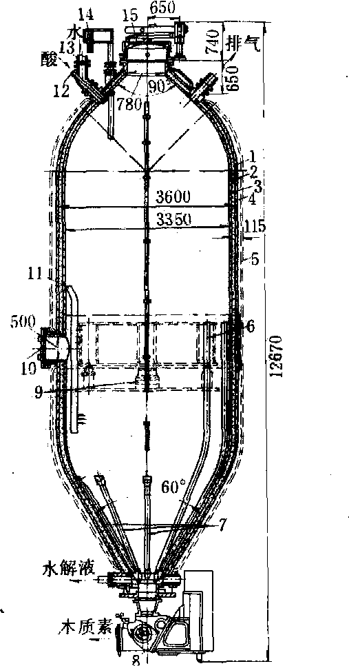 图1 水解流程示意 1.水解器; 2.皮带送料机; 3.水力排渣阀; 4.木质素喷放仓; 5.高压闪蒸器; 6.低压闪蒸器; 7.高压换热器; 8.低压换热器; 9.回用水槽; 10.泵; 11.进水高压泵; 12.热水器; 13.贮酸槽; 14.计量器; 15.柱塞 泵;16.水酸混合器 水解器是水解生产的关键设备,在苏联该项设备在向系列化、大型化方向发展。常见的计有容积为18、20、30、37、40、50、70、80及160立方米9种。70立方米容积水解器结构见图2。