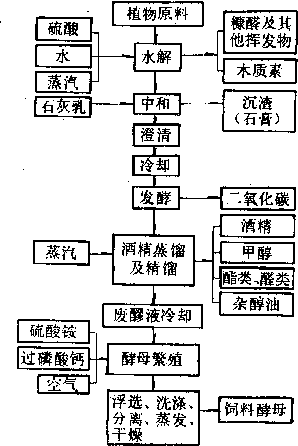 水解所得单糖中,属于己糖的除葡萄糖外,尚有甘露糖及半乳糖,戊糖为木糖及阿拉伯糖。在高温酸水解条件下,单糖将进一步发生分解。已得到生产应用和正处于研究开发中的水解方法主要有以下几个:稀硫酸高温渗滤水解法 简称渗滤水解法。是国际上目前大规模工业生产酵母和酒精唯一应用的一种水解方法。水解时由水解器顶部向器内连续泵入高温稀酸溶液,使其透过(渗滤)水解物料层及时地将已水解出的单糖液(水解液)排出反应空间,以减少糖的分解,获得高的得糖率。半纤维素、纤维素的水解速度及其水解出的单糖的分解速度均相差甚远,植物纤维原料的形态在水解过程中变化很大,这些因素要求水解温度要由低(175℃)向高(190℃)逐渐升温,且要严格控制渗透速度。水解时,硫酸浓度为0.5~0.8%,水解液比(水解液采出量与干基原料重量比)为14左右。渗滤法水解生产工艺包括原料制备(粗大原料削片、粉碎)、水解、水解液中和、澄清等基本工序。水解流程如图1。