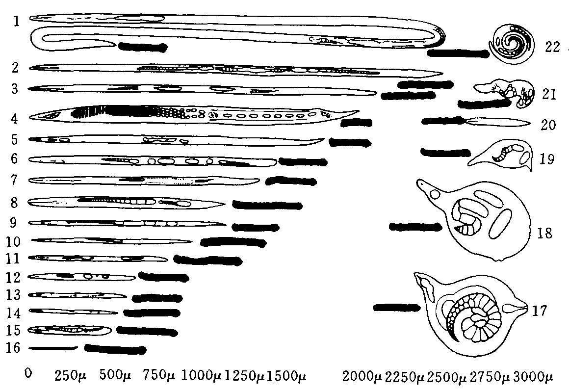 总体形态 典型植物寄生线虫似线条,放大的虫体呈纺锤形或梭形,从中部向两端渐细,大致长0.2~12毫米和宽0.01~0.05毫米不等。少数类群的雌虫膨大成梨形、柠檬形、肾形、珍珠状或其它不规则囊状(图1,2)。线虫无色,不分节。虫体最前端是由唇片组成的唇部或称头部。唇片一般6枚或少于6枚。肛门以后的虫体是尾部。在头部、尾部之间的虫体称为体部。头部与其它部位往往有缢痕相隔。头内有不同角化程度的头架。在头部和尾部分别包括神经系统的侧器(amphids)、乳突(papillae)和尾感器(phasmids)等感觉器官。线虫纵向分为背区、右侧区、左侧区和腹区,两侧对称。线状线虫往往不同程度地向腹面弯曲,弯曲显著的呈弓形、C形或螺旋状等,肛门、阴门和排泄孔都在腹面。线虫的基本结构是由两条相套的体管即外体管或体壁和内体管或消化道组成。内、外体管之间为充满体液的假体腔。在体壁内除消化道外,还有生殖、神经及排泄各生理系统。生殖系统是在线虫由幼虫发育为成虫过程中逐步发展和完善起来的。线虫没有循环系统和呼吸系统。