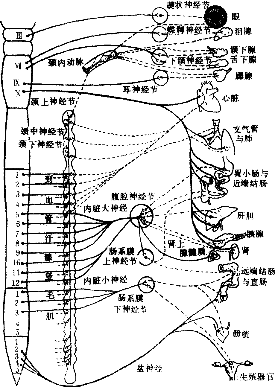 释义 | 植物性神经zhí wù xìng shén jīng周围神经系的一部分。也称自主神经。1903年汪荣宝等《新尔雅·释生理》:“植物性神经系统之中枢部及末梢部,为植物性神经系统,亦谓之交感神经系统。” 植物性神经 植物性神经zhiwuxingshenjing又称自主神经或内脏运动神经。由脑和脊髓发出的支配内脏、心血管及腺体的传出神经。分为交感神经和副交感神经。其结构区别于躯体运动神经的主要特点是,神经元的轴突自中枢发出后不直达效应器,兴奋从中枢到效应器之间的传递,是由两个神经元完成的,两者之间有一个神经节。一个节前神经元可和多个节后神经元发生突触。节前神经元的胞体在脑干和脊髓的胸腰段和骶段。由中枢发出的神经纤维叫节前纤维,由神经节内神经元发出的纤维叫节后纤维。节前为有髓纤维,节后为无髓纤维。人体内脏器官接受交感与副交感神经的双重支配,交感神经系统的活动一般比较广泛,主要保证人体在紧张状态时的生理需要,副交感神经的作用不广泛,主要维持安静时的生理机能。两者对效应器官的影响是相互拮抗。在中枢大脑皮质和脑的各级植物性神经中枢的调节下又是统一的。按植物性神经末梢的化学递质的不同,全身传出神经纤维,又可分为肾上腺能纤维和胆碱能纤维两大类。 图497 植物性神经分布示意图 ☚ 迷走神经 交感神经 ☛ 植物性神经 植物性神经zhiwuxing shenjing支配内脏、腺体和血管壁的运动神经,包括交感神经和副交感神经两部分。植物性神经所支配的器官活动通常不能随意控制,如心跳、胃肠活动等,因此植物性神经又称自主神经。交感神经从脊髓的全部脑髓和上三节腰髓的灰质侧角内发出,借短短的交通支和脊髓两侧的交感干联系,然后由交感干神经节发出节后纤维,以支配胸腹部的脏器和血管的活动。副交感神经发自中脑、桥脑、延脑和脊髓骶部,其节前纤维在副交感神经节中交换神经元,然后由此发出节后纤维,至平滑肌、心肌和腺体。副交感神经节一般位于脏器附近或脏器壁内。交感、副交感神经在机能上具有拮抗性质,交感神经在机体应付紧急情况时起作用,副交感神经起着平衡作用,抑制体内各器官的过度兴奋,使它们获得必要的休息。 ☚ 周围神经系统 反射弧 ☛ 植物性神经vegetative nerve系整个神经系统的一个重要组成部分,主要分布于内脏、心血管系和腺体。植物性神经含有内脏运动纤维和内脏感觉纤维,在中枢神经系统的调节下,管理内脏的正常活动和机体的新陈代谢,以保证内环境的平衡。植物性神经和躯体性神经在形态和功能上有很多不同:躯体性神经支配骨骼肌而植物性神经支配心肌、平滑肌和腺体;躯体性神经运动纤维自脑和脊髓发出后,直接到达效应器,而植物性神经自脑和脊髓发出后不直接到达效应器,而是要在周围部植物神经节中换1次神经元,然后再到达支配器官(因此植物性神经分为换神经节以前的节前纤维和换神经节以后的节后纤维);躯体性运动神经元的细胞,分布于中脑以下至脊髓全长,植物性节前神经元的胞体只见于中脑、脑桥、延髓和部分脊髓(胸1~12、腰1~3、骶2~4)中;躯体性神经纤维一般较粗,有明显的髓鞘,而植物性神经纤维一般较细,髓鞘较薄或不具髓鞘。植物性神经根据其形态、功能的不同,又分为交感神经和副交感神经。 |