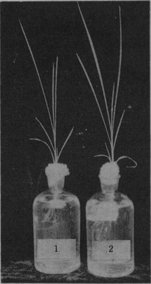 图1 用等量养分培养的水稻秧苗 1.无机磷 2.肌醇六磷酸