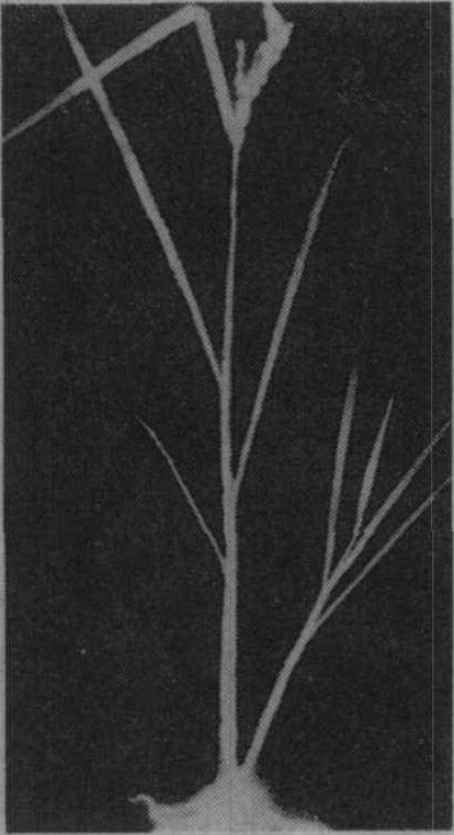 对糖类、酚类等有机物的吸收 有机肥中含有多种可溶性糖,包括蔗糖、阿拉伯糖、果糖、葡萄糖、麦芽糖等。其中葡萄糖含量较高,是植物最易吸收的一种中性糖。孙羲等以水稻为材料,用14C-葡萄糖进行无菌培养试验,分别在培养1天及5天后取样,制备放射自显影照片。结果表明:1天内穗部即带放射性,14C-同化物已达穗部;5天内整株水稻带放射性,14C-同化物已分布到水稻植株各部分(图2)。14C-同化物在水稻植株内的分布情况见表1。