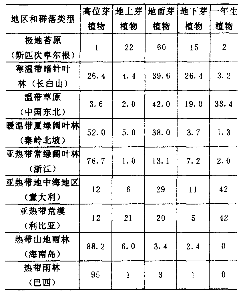 释义 | 植物生活型 植物生活型zhiwu shenghuoxing不同种植物长期适应一定的生活环境,具有某些共同外貌特征和利用环境资源方式。这是与分类学不同的划分植物类型的方法。同一科(属)的植物种可能是同一生活型,但更多情况不属于同一生活型。肉质植物具有肥厚多汁茎或叶、景天型光合作用等共同特征,却分属40科。同一种植物的个体生活在迥然不同生境中亦可产生显著差别而归属不同生活型,如岳桦在森林上限附近发生树干膝曲和矮化现象,在下面则正常生长。 生活型谱 (%) 上表指出高位芽植物在湿暖环境比重增加,一年生植物在干旱环境最多,地面芽植物在冷凉环境中拥有较大优势。但更深入分析时需要结合生态类型组成特点进行。 ☚ 限制因子 植物生态类型 ☛ |