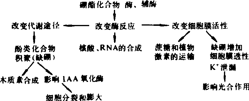 硼的生理功能 硼与糖或糖醇络合形成硼酯,这是硼一切生理功能的基础。硼与糖形成的化合物有下列几种: 由于硼酸和二相邻羟基的比例以及基质pH值的不同而生成不同的硼酯类化合物。这些硼化合物可能参与一系列代谢进程(图)。形成硼酯复合体需要具有相邻顺式二元醇构型的多羟基化合物,包括多种糖类及其衍生物(如糖醇和糖醛酸),特别是甘露醇、甘露聚糖以及甘露糖醛酸。相反,葡萄糖、果糖以及半乳糖及其衍生物(如蔗糖)不具备这种顺式二元醇构型,因此不能形成稳定的硼酸复合体。一些磷二酚,如咖啡酸和阿魏酸,它们是双子叶植物木质素生物合成的前体,具有顺式二元醇构型,因此能形成稳定的硼酸复合物。 硼对植物影响的可能途径和顺序 高等植物的总硼量有很大部分是以顺式硼酸酯形式络合在细胞壁中。双子叶植物需硼量高于单子叶植物,这是与细胞壁,主要是半纤维素和木质素前体中具有顺式二元醇构型的化合物比例高有关。单子叶植物如小麦的细胞壁中牢固结合态硼的含量为3~5微克/克干重,而双子叶植物如向日葵中则高达30微克/克干重。这种差异反映了不同植物种之间硼的需要量不同。 细胞伸长和组织分化 缺硼的最显著的反应就是主根和侧根的伸长受抑制,使根系呈短粗丛枝状。植物缺硼,根内IAA氧化酶的活性迅速提高,根伸长减慢。 已发现生长素(IAA)和硼之间有明显的相互作用。绿色植物中,IAA只有在维管植物中形成,它参与木质部导管的分化,因此,一般对硼的需求也仅限于维管植物。缺硼对组织分化的影响是典型的。缺硼导致根伸长减慢,茎形成层组织细胞分裂加强,形成层细胞增生,以及木质部分化削弱。缺硼植株中,生长素水平比正常植株高得多。外源IAA诱发的根尖解剖学变化与缺硼时相似,这曾使人们认为,植物的缺硼症状是生长素水平增高的一种反映,然而缺硼和IAA水平过高所引起的根尖结构变化并不相同。在比较不同的植物种类或植物器官时并未发现IAA水平和缺硼症状间有明显关系。只有那些对缺硼有反应而积累某些酚类的植物,其IAA才会提高。因为这些酚类化合物是IAA氧化酶活性的有效抑制剂。某些酚化合物不仅是根伸长的有效抑制剂,而且能同时促进细胞径向分裂。其诱发的形态学变化与IAA引起的变化相似。 酚代谢和木质素形成 缺硼将导致植物体内酚类化合物积累。酚类化合物积聚能抑制IAA氧化酶的活性。在正常植株中,硼能与酚类化合物络合,克服酚类化合物对IAA氧化酶的抑制作用。在木质素形成和木质部导管分化过程中,硼对羟基化酶和酚类化合物酶的活性起控制作用。植物缺硼导致酚类化合物和IAA代谢的改变,植物组织受损伤,与植物受微生物侵入受损的情况相同。因此缺硼组织的代谢变化和细胞的破坏,很可能是缺硼组织本身的酚类化合物累积造成的。硼在调节酚代谢和木质化作用方面的功能可以概括如下: 硼似乎不仅调节底物转向戊糖—磷酸循环,而且还通过形成稳定的酚酸,特别是咖啡酸—硼酸复合体来调节木质素的生物合成。因此,缺硼时有酚类积累,这会促进多酚氧化酶(PPO)的活性,导致细胞壁中高活性的中间物如咖啡醌的浓度增高。 碳水化合物运输和蛋白质代谢 硼在碳水化合物代谢中的功能主要集中在两方面:细胞壁物质的合成和糖的运输均与硼有关。硼能促进葡萄糖-1-磷酸的循环和糖的转化。在缺硼的植物根中,标记磷(32P)结合进入核苷酸受阻,而己糖磷酸盐积累。因此,利用碳水化合物合成纤维素或RNA的反应也会在由己糖磷酸盐形成核苷酸的阶段受阻。缺硼使细胞壁的形成受阻。硼不仅和细胞壁成分紧密结合,而且是细胞壁结构完整性所必需。它与钙共同起“细胞间胶结物”的作用。 植物缺硼时核酸含量下降,强烈地影响RNA合成。特别是尿嘧啶合成受到削弱。而尿嘧啶核苷酸是RNA的主要组分,也是高能磷酸盐的前体: 缺硼植株RNA含量下降,新叶蛋白质含量降低,而可溶性氮化合物,尤其是硝酸盐积累。蛋白质含量降低仅限于细胞质,而叶绿体蛋白质含量则不受影响。这一结果与缺硼时失绿现象并不普遍的事实是一致的。缺硼对叶子代谢和组成的影响是间接的,缺硼影响根的生长和细胞分裂素的合成和向地上部的输送,硼对烟草尼古丁生物碱有相同影响。 花粉萌发和花粉管生长 种子和谷粒生长所需的硼量往往比营养生长高。玉米和三叶草都是如此。硼对受精具有间接的和直接的双重影响。硼的间接作用可能与花蜜中糖量的增高及其组成的变化有关,使虫媒植物的花对昆虫更有吸引力。而硼的直接作用反映在供硼与花药的花粉产生能力以及花粉粒生活力之间的密切关系上。而且,硼能刺激花粉萌发,特别是花粉管伸长,油菜缺硼导致“花而不实”,主要是由于花粉萌发和花粉管伸长受抑制。 玉米花粉萌发和受精要求的含硼量至少为3微克/克干重,而柱头的缺硼临界水平更高。葡萄是需硼量很高的一种作物,当其柱头含硼量为8~20微克/克干重时授粉就减弱。1980年刘易斯(Lewis)的研究表明,以形成硼酸—胼胝质复合体使来自花粉管壁的胼胝质的生理活性钝化,要求在柱头和花柱中有高水平的硼。在硼水平低时,胼胝质量增加,并诱发植物防御素(包括酚类化合物)合成。形成一种与受到微生物侵染时所产生的相似的防御机制。 硼是种子和果实形成所必需。水稻缺硼每穗粒数减少,大麦缺