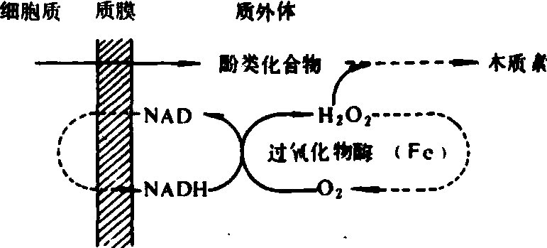 图3 铁氧还蛋白的可能电子受体 在铁—卟啉蛋白中铁是作为高铁血红素(heam)或氧化血红素的辅基。铁的作用与存在于叶绿素的卟啉结构中镁的作用相似。这些高铁血红酶系统包括过氧化氢酶、过氧化物酶、细胞色素氧化酶以及各种细胞色素。过氧化氢酶和过氧化物酶催化下列反应: H2O2+H2O2 AH2+H2O2 细胞色素在电子传递中起重要作用,呼吸链末端也有细胞色素氧化酶的参与。当铁的供应不足时,所有这些酶的活性均降低。 在第二种类型的反应中,结合在细胞壁上的过氧化物酶催化酚类化合物聚合成木质素的反应。在根表皮和内皮层细胞壁中有大量的过氧化物酶,对铁的吸收具有调节作用。因为合成木质素的酚类化合物被释放到表皮细胞质外体中,在H2O2参与下合成木质素。H2O2由质膜上NADH氧化所产生,受另一种过氧化物酶催化,其原理如图4所示。 虽然铁血红素在植物代谢中极为重要,但血红素中的铁仅占叶子中全铁量的0.1%,大部分铁是以铁磷蛋白的形态贮存,称为植物铁蛋白(phytoferritin)。叶子中植物铁蛋白贮存作为形成质体(plastids)用,它是进行光合作用所必需。叶绿体中含有大量的植物铁蛋白,所含铁占植物体中全铁的80%。 图4 过氧化物酶作用与木质素合成间的关系 绿色植物铁的供应水平和叶绿素之间常有良好的相关性。植物铁素营养充足,叶绿素含量就高;植物缺铁时,含铁的酶如过氧化氢酶和过氧化物酶的活性减低(表1)。