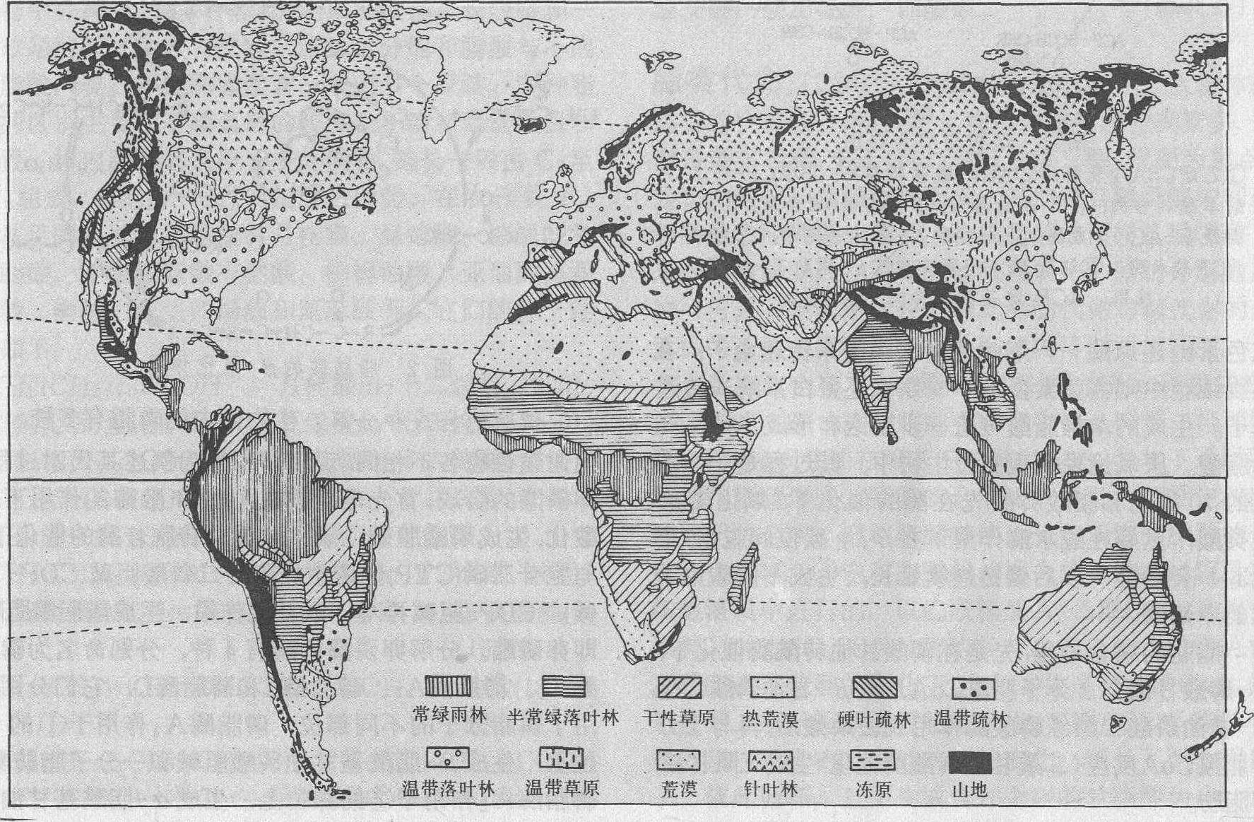释义 | 植被zhíbèi覆盖地面的较为密集的植物的总和 植被zhíbèi〈名〉覆盖在一定地区地面上的,较为密集的许多植物的总和:保护植被│自然植被│全球植被。 植被zhíbèi覆盖在某一地区的地面上具有一定密度的植物的总合。 植被zhíbèi【释义】 植被zhí bèi在某地区内覆盖地面,有一定密度的植物的总和。1958年《新知识词典》“自然带”条:“自然带的划分主要是根据植被的分布,所以它也叫做植物带。” 植被vegetation在一定地区内,覆盖地面的植物及其群落的总称。地球表面每个地带或每个地区,都有一定类型的植被。地形、气候和土壤等环境条件的差异,是导致植被具有各式各样的类型及其分布特点的重要原因。植被的地带性分布总是与一定的气候条件,主要是热量和水分相联系,而非地带性分布则与局部地区的地形、土壤条件相联系。地球上主要的植被类型及其分布如下(图1、图2)。 图 1 世界植被分布图 热带雨林和红树林 热带雨林分布在终年高温多雨的赤道气候带,是地球上种类成分最丰富的一种植被类型,林内乔木、灌木、草本、藤本以及附生、寄生植物种类丰富,成层现象复杂,优势种不明显,终年常绿,生长和繁殖终年持续不断,板状根、茎花现象和绞杀植物等都是热带雨林的特征。南美亚马孙河流域和赤道非洲的西部,中美洲的东部,印度西南沿海,中印半岛的西部为世界热带雨林主要分布地区。中国的台湾南部、海南省、云南南部、西藏东南部的低山河谷地区,以及许多热带岛屿上出现非典型的热带雨林。红树林主要分布在热带季风海岸淤泥滩上,在远离赤道的32°N和44°S附近也有零星分布。红树林以红树科、马鞭草科或海桑科为主,密集的支柱根、特殊的板状根和呼吸根以及“胎生”的繁殖方式是其特征。从亚洲的马来半岛、大巽他群岛,直至日本南部(九州),以及澳大利亚大陆北部,非洲东岸的坦桑尼亚和莫桑比克之间,喀麦隆和刚果河口,美洲的佛罗里达半岛南部,墨西哥湾沿岸均有红树林分布。中国浙江、福建、广东、广西、海南和台湾等省区沿海也有少量分布。 季雨林和稀树草原 季雨林分布在热带季风气候区有周期性干湿季节交替的地方。旱季降水少,温差大,群落或多或少是落叶或全部落叶的,季相明显,在亚洲、非洲和美洲等季风热带地区,季雨林呈不连续分布,如印度的德干高原,缅甸、泰国、老挝、越南等地的干热河谷和盆地,在印度尼西亚的加里曼丹、苏拉威西、伊里安、帝汶等岛屿中受干燥季风影响的地方,其分布北界大体上与热带界线相符合,柚木林是其中的一类。中国台湾、广东、广西、云南和西藏等局部地区也有季雨林分布,其中如青皮、木棉、擎天树等为标志种类。稀树草原亦称萨王纳群落,是一种热带型的旱生草本群落,其中稀疏地生长着旱生的乔木或灌木。全年气候干热,降水不均,主要分布在非洲撒哈拉大沙漠的南部,南美洲巴西东部和委内瑞拉、圭亚那等地的热带范围内,草本植物有禾本科的须芒草属,黍属和龙胆科的绿草属等。旱生乔木树种如伞状金合欢、猴面包树、纺锤树等。在澳大利亚和亚洲也有分布。中国的稀树草原主要分布在云南、广东、海南等省的山间峡谷低丘陵和海滨台地上以及云南、贵州、广西等省区的亚热带山地干热河谷地区,大多数属次生植被性质。 常绿阔叶林 分布在亚热带温暖湿润的季风气候区内,夏季炎热而潮湿,冬季稍微干寒,如非洲的加那利群岛和马德拉群岛,美洲的佛罗里达,墨西哥的北部和巴西的东南部。植被主要由壳斗科、樟科、山茶科、木兰科等树种组成,终年常绿,林相整齐,多数草质的叶面被蜡层,且常与光线照射方向垂直,又称照叶林。中国是亚洲常绿阔叶林发育最典型并有大面积分布的区域,竹林、杉木林、柳杉林都是亚热带森林植被的重要类型之一。此外,常绿阔叶林在日本、朝鲜南部和大洋洲也有分布。 落叶阔叶林 又称夏绿阔叶林,是温带湿润海洋气候条件下的地带性植被类型。生长季节内有适宜的降水,但冬季较长且比较寒冷,树木落叶,群落外貌有明显的季相更替,乔木一般具有宽阔的叶片,以栎属、山毛榉属、桦属、槭属等较为常见,主要分布在北美大西洋沿岸、西欧和中欧海洋性气候的温暖区域以及亚洲东部、中国华北、朝鲜和日本等地。 针叶林 属于寒温带的地带性植被类型。夏季温暖潮湿,冬季严寒,由大多具针状叶的松杉类植物和松属、云杉属、冷杉属、落叶松属等树种构成纯林或混交林,主要分布在北半球高纬度地带或亚热带高山亚高山上。无论欧亚大陆或北美,针叶林都很发达,从温带起向北延伸,连成非常宽广的地带,一直达到森林的北界,通称泰加群落。南半球的针叶林很少,大都出现在山区。 草原 以多年生旱生禾草植物占优势的草本植物群落,属于温带大陆性气候下的地带性植被类型。草原地区气候干燥,雨量少而变率大,且多集中在温暖的夏季。冬季寒长。禾本科、豆科等植物占优势,其中针茅属为最典型的丛生禾草。此外,菊科、藜科和其他杂类草也占重要地位,季相更替明显。欧亚大陆的草原从匈牙利多瑙河下游起,经黑海沿岸横贯苏联西伯利亚、蒙古,一直延伸到中国的黄土高原西北部、内蒙古高原和松辽平原,通称为干草原;北美草原分布在密西西比平原以西与落基山脉之间; 南美草原分布在阿根廷和乌拉圭的大部地区,