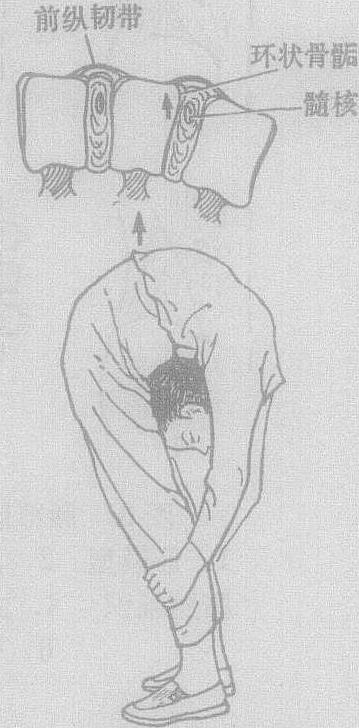 由于脊柱长期的反复过伸活动所致。少年期髓核水分较多,弹性和活动性大,在专项练习或腰部柔韧性训练中,如“下腰”、“小翻”、“倒踢”等动作都使脊柱过伸,此时,髓核被挤向“张开”的椎体前部,因为受到前纵韧带的阻挡,产生对环状骨骺的挤压。反复或持久的挤压,就可导致环状骨骺的变性(见图1)或将髓核挤入骺板,使骺分离。因此,腰部柔韧性较好的体操运动员和舞蹈演员患病率也较高。