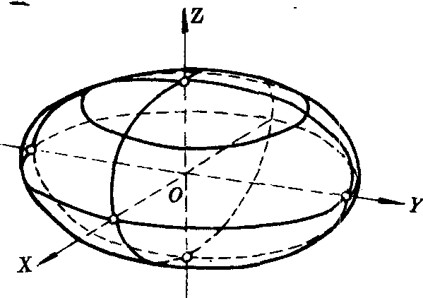 ❷截距 在X轴上的截距为±a,在Y轴上的截距为±b,在Z轴上的截距为±c.(±a,0,0),(0,±b,0),(0,0,±c) 叫做端点或顶点,椭圆面与三个坐标轴相截所得的三条线段叫做轴,若a≥b≥c,则称a,b,c分别为椭圆面的长半轴、中半轴和短半轴.