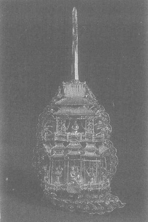古代名物 > 珍寳類 > 金銀部 > 金器 > 樓閣人物金簪 樓閣人物金簪 lóugérénwùjīnzān 明代金質簪,上編織出樓閣人物,故名。通高十八·二厘米,重四十一·八克。於細絲編織的葉形襯底上,用金片與金絲作出上下兩層樓閣,上層閣内有一人端坐正中,兩旁爲執扇侍女。下層廊内正中有一人呈倚坐狀,兩側有侍女執物伺候。此金簪用高超的掐絲工藝,編織出多層次的精美紋樣。1958年10月,江西省南城縣明益莊王朱厚燁墓出土。中國歷史博物館藏。 楼阁人物金簪 楼阁人物金簪明。通长18.2厘米。重41.8克。1958年江西省南城朱厚烨墓出土。北京中国历史博物馆藏。明益庄王朱厚烨墓出土文物非常丰富,仅金、银、玉器即达255件。此金簪用累丝法制成,楼阁、人物,金光闪闪,十分精致。明中期以后,统治者日趋腐朽,朱厚烨系宪宗朱见深之孙、益端王朱祐槟之子,《明史》称其“性素朴,外物无所嗜”,为一时“贤王”。墓中出土的随葬品表明,这只不过是些溢美隐恶之辞。