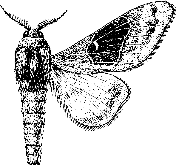 橄榄枯叶蛾 学名Metanastria terminalisTsai et Hou,分布于中国福建和广东。寄主有橄榄和鸡尖树。幼虫食叶颇为严重。成虫体长30~35毫米,棕褐至赤褐色。雌前翅有3条横带,亚外缘部有由约7个黑色斑点组成的点列;后翅外半部暗褐色。雄触角前半部羽枝较短,前翅色深暗,中部有一深咖啡色似三角形斑,为银灰色的内、外横带所包围,各以白线纹为边,三角斑内有一黄褐色新月形小斑纹,亚外缘斑点列黑褐色。后翅外半部有污褐色斜横带(图2)。幼虫灰褐色,有许多毛丛。福州年生2代,以幼虫越冬。3、4月幼虫活动为害。幼虫白天成片群栖于树干,主要在夜间取食于叶片。5月中旬结茧化蛹。6月中、下旬羽化为成虫。6月下旬至7月上旬新一代幼虫发生为害,初龄幼虫成片栖息于叶片上,并成群结队迁移。在叶间结丝茧化蛹。可采取捕杀幼虫和蛹茧,幼龄期喷洒白僵菌剂进行防治。 图2 橄榄枯叶蛾 |
