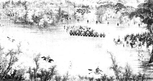 释义 | 乾隆帝阅马技图 【作品赏析】: 这是一幅巨型历史画,它描绘乾隆十九年(1754),乾隆皇帝弘历在承德避暑山庄内接见蒙古族辉特部阿睦尔撒纳、硕特部班珠尔和杜尔伯特部纳默库等人的场面。 清朝初年,在新疆一带游牧的蒙古族各部,由于部落间的纷争和沙皇俄国的挑唆,时有叛乱发生。康熙、雍正、乾隆三个皇帝都十分重视和西北边疆蒙古族的关系,对于武装叛乱采取坚决的措施,对于来归附的蒙古族各部则封赏甚厚。以上蒙古族各部首领归附后,乾隆皇帝十分高兴,特地在避暑山庄设宴招待他们,赏赐丰厚的金银绢帛,并和他们一同观看八旗兵将的马技表演。 画中弘历骑坐在一匹花马上,处于一个由众多王公大臣组成的锥形阵型的前端,十分显眼突出;画面中部来归的蒙古族首领排列整齐,正在观看由画面左上角绕出的马队,表演者或在马上倒立,或在马上托举,或在马上弯弓搭箭,做出各种难度很大的惊险动作,使画面具有生动活泼的气氛。乾隆皇帝和重要的人物均具肖像的特征,非常真实具体;在构图上,作者没有将乾隆皇帝置于画面正中,而略偏于右侧,反倒将蒙古族各部的首领画在中间,这样的安排当然一定要取得乾隆皇帝的同意,但画家在创作中也是对过去程式的一个突破。从画上看,主要人物及其坐骑,采用西洋画法,是出自郎世宁的手笔,而次要人物及背景的树石等,则画风有别,或为中国画家所补绘,虽然画幅只署了郎世宁一人的姓名,但可将它视作是以郎世宁为主的一幅集体创作。 此图画于乾隆二十年(1755),画完后悬挂在承德避暑山庄的卷阿胜境殿内。。