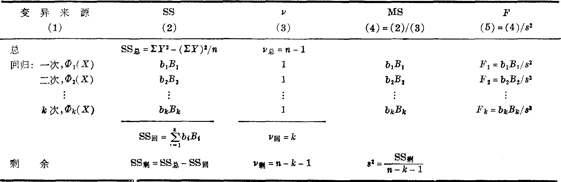 摘自 山内二郎:统计数值表,404,JSA-1972 在多项式回归分析或多项式曲线拟合中,当自变量按等间隔取值时,可利用预制的正交多项式表求各回归系数,使运算过程大大简化,并使不同方次的回归方程的假设检验可以同时进行。 多项式回归分析的方法步骤如下: (1)根据样本含量n,采用相应的正交多项式表;并按数据描绘的散点图或以往的经验初步确定多项式的方次k (一般k≤5即可,故表中只列出高达5次的正交多项式);从而列出计算表(如表3)。首先计算 则回归方程为 (2)对正交多项式回归进行拟合优度的逐步比较(参见“曲线拟合优度的比较”)。可按表2作方差分析。 表2 正交多项式回归的方差分析 注意:每次多项式φi(X)的系数bi及相应的Bi= ![]() biBi=Bi2/si 看作是第i次多项式φi(X)的效应,而回归平方和则是各次效应之和。因此检验所配各次多项式Φi(X)对Y有无贡献,可用各次效应biBi与剩余均方进行F检验,Fi的自由度为1,n-k-1。对于那些没有贡献的高次项可从回归方程中删去。s2之比: 例 不同室温下测定家兔的血糖值,结果如下,试用正交多项式拟合适当的曲线。