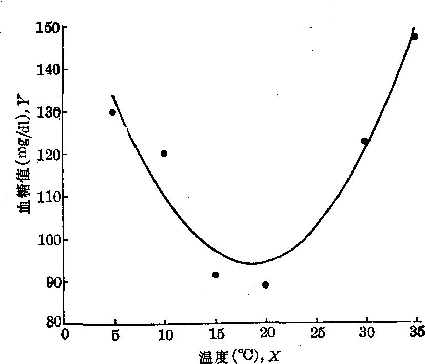 按(X,Ŷ)绘曲线如图,图中黑点是观察值(X,Y)。 室温与家兔血糖值的关系 ☚ 多元线性相关 逐步回归分析 ☛ |