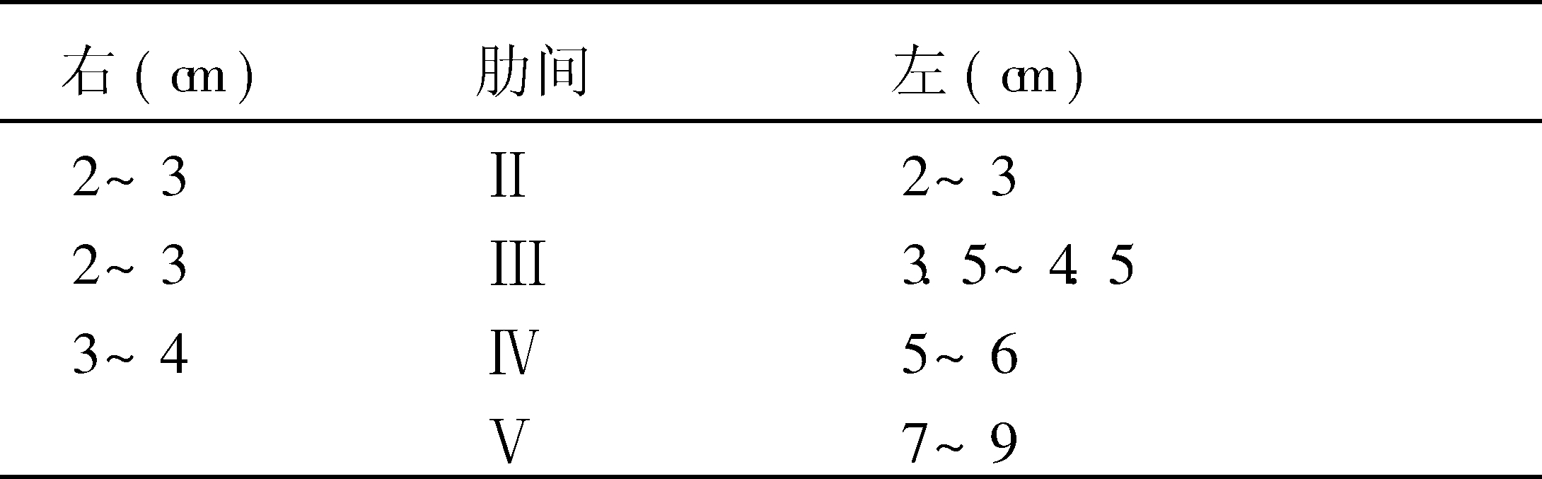 释义 | 正常心界 正常心界normal cardiac boundary指心脏的左右相对浊音界。即心脏在前胸壁上的投影。正常人右心界几乎与胸骨右缘相合,在第4肋间处可在胸骨右缘稍外方;左界第2肋间几乎与胸骨左缘相合,其下方则逐渐左移,并继续向左下形成向外突起的弧形。正常成人心脏相对浊音界为: 正常成人心脏相对浊音界 ☚ 心脏绝对浊音界 心界听诊定位法 ☛ |