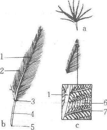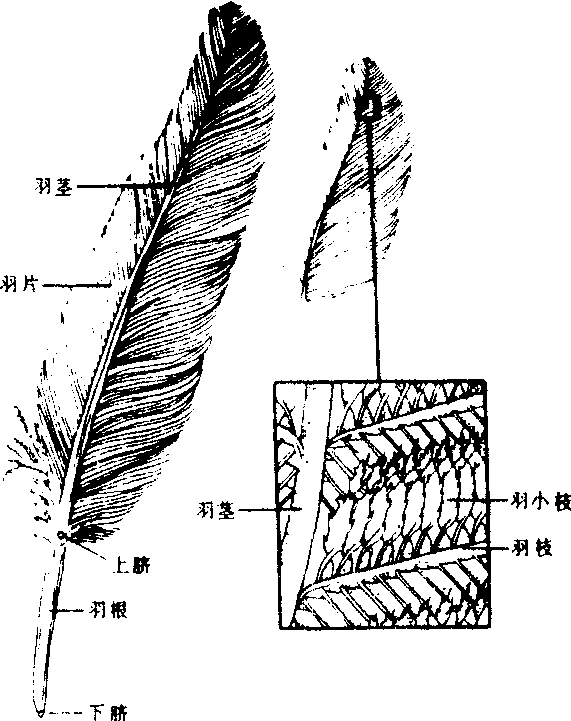 羽 a.绒羽 b.正羽 c. 部分羽片放大,示羽小枝的连接 1. 羽茎 2. 羽片 3.上脐 4. 羽根 5.下脐 6. 羽小枝 7. 羽枝 正羽 正羽zhengyu鸟类羽毛的一种。鸟两翼的飞羽和尾部的尾羽,以及覆盖在头部、躯干部表面的覆羽,均为正羽。正羽由羽轴和羽片组成。羽轴是支持羽片的中轴,羽轴的下端呈半透明管状部分为羽根,末端有一小孔,叫下脐,可用此孔从真皮的血液中吸取营养;羽轴的上部为实心的羽干,两侧有由密生的羽枝,彼此借羽小枝上的羽小钩和羽小齿钩结成的羽片。覆羽的羽片左右对称,飞羽的羽片左右不对称,外羽片狭窄,内羽片较宽。鸟翅上的一个正羽的外羽片覆盖着邻近的另一个正羽的内羽片上,有利于鸟类在高空飞翔时减少空气对翅膀的上压力,增加气流的上浮力。羽根的上端和羽干基部的腹面有一纵行浅凹,叫上脐,为羽毛发生期形成羽枝开口的残留部分。上脐周围常有丛生的副羽。鸽的副羽不发达,鸸鹋的副羽和正羽在形态上同样发达。正羽可制羽扇和装饰品。
