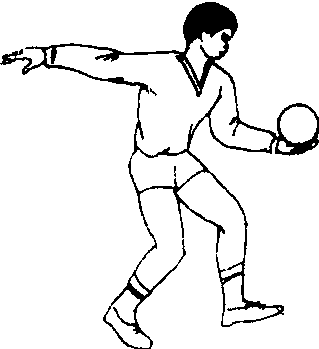 ❷抛球:左手将球垂直平稳地抛至体前右侧,离手高度约30厘米。抛球同时右臂伸直后摆,重心适当后移。