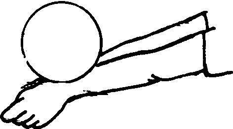 ❹击球——球到腹前时,前臂插入球下,蹬地抬臂,手腕下压,以小臂前部垫击球的后下部。