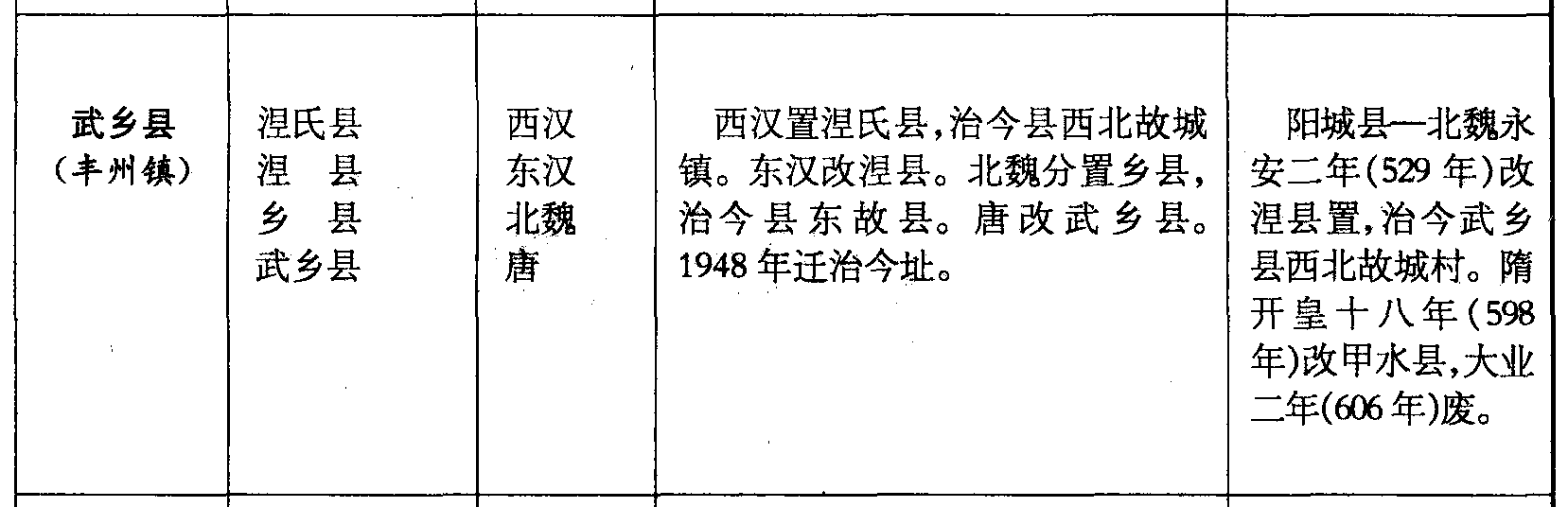 武乡县(丰州镇)𣵀氏县𣵀 县乡县武乡县西汉东汉北魏唐西汉置𣵀氏县,治今县西北故城镇。东汉改𣵀县。北魏分置乡县,治今县东故县。唐改武乡县。1948年迁治今址。阳城县—北魏永安二年(529年)改𣵀县置,治今武乡县西北故城村。隋开皇十八年(598年)改甲水县,大业二年(606年)废。