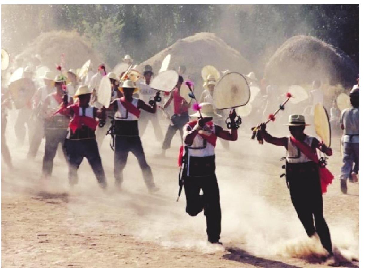 传统舞蹈。国家非物质文化遗产。旋鼓舞也叫扇鼓舞或羊皮鼓舞,是一种舞乐结合的群众性民间广场舞蹈艺术。代表地区有武山的滩歌镇、洛门百泉、龙台、山丹等镇村。最初的作用是牧童用来震慑狼群、减灾避害的活动方式,后来发展成为民间祭祀、祷告、祈助等宗教仪式。羊皮鼓为男性群体舞蹈,表演人数数十人或数百人上千人均可。演出方式以行进、圆场式为主。道具有羊皮鼓一面,鼓槌一只。鼓为单面鼓,状如团扇,以木或扁铁做框,上蒙羊皮,柄下置三孔佩九环,鼓时九环互触有声。鼓槌用羊皮或麻绳编成,状如秦剧中的马鞭,长约一尺有半,由鼓槌、鼓柄、槌穗(为红色)组成。动作有原地击、跑跳击、跑步击、吸腿击、蹉步击、下蹲击、翻身击、半蹲击、虎跳击、箭步击、互击 11 种。最精彩者为跑跳击、吸腿击、虎跳击。跑跳击,舞者左手持鼓于左胸前,右手握鼓槌击鼓,左脚向前跑跳一步,右脚抬起,左脚垫跳一步后,右脚落地跑跳一步,左脚抬起连续按一拍节奏反复。吸腿击,左手持鼓于左胸前,鼓面朝右,右手持鼓槌从右侧上方击鼓。一拍击鼓、二拍响铁环。左脚合第一拍脚尖着地,脚跟提高,右腿脚尖蹦直吸腿。第二拍脚跟落地、右腿还原。第三、四拍与第一、二拍做相反动作。虎跳击,左手持鼓,右手持鼓槌落地作翻虎跳后击鼓。表演时,舞者戴草帽,穿对襟上衣,内带绣花肚兜,外套白色马夹,腰系青色布带,下着青色或蓝色大裆裤,脚蹬麻鞋,鞋尖饰红色或青色穗子,左手持鼓右手握鼓槌和着鼓点在领舞者引领下或奔或突或旋或圆,忽左忽右,时缓时趋,形成旋场、旋蜗牛、旋八字、旋四角、剪子扣、旋麻花、开四门、太子游四门、白马分鬃、蛇蜕皮、钻口袋、蛇嗖道、蚰蜒出洞、二龙戏珠、钻花眼等 19 种队形。