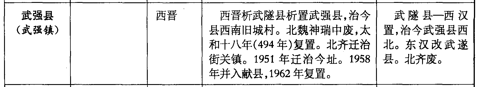 武强县(武强镇)西晋西晋析武隧县析置武强县,治今县西南旧城村。北魏神瑞中废,太和十八年(494年)复置。北齐迁治街关镇。1951年迁治今址。1958年并入献县,1962年复置。武隧县—西汉置,治今武强县西北。东汉改武遂县。北齐废。