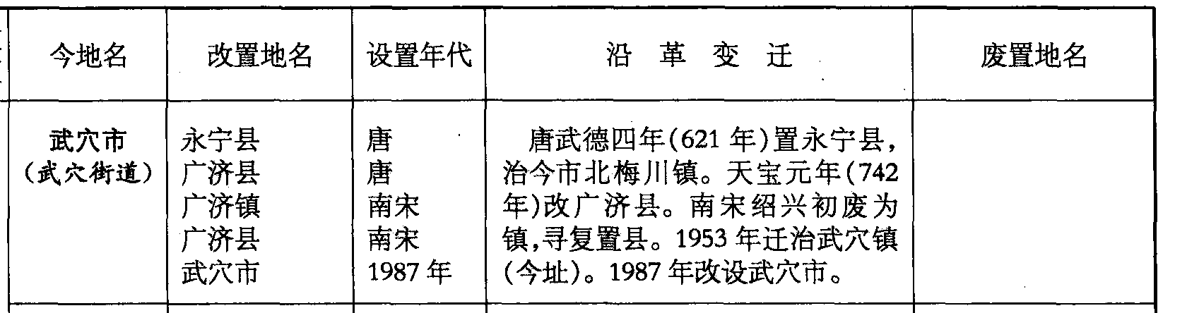 武穴市(武穴街道)永宁县广济县广济镇广济县武穴市唐唐南宋南宋1987年唐武德四年(621年)置永宁县,治今市北梅川镇。天宝元年(742年)改广济县。南宋绍兴初废为镇,寻复置县。1953年迁治武穴镇(今址)。1987年改设武穴市。