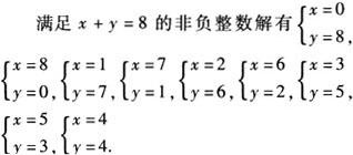 释义 | 二元一次方程的一个解 适合一个二元一次方程的一组未知数的值,叫做这个二元一次方程的一个解. 例1 已知 A.2 B.-2 C.1 D.-1 答 A. [解析] 由2k-1=3,得 k=2. 例2 方程x+y=8的非负整数解的个数是( ). A.8 B.9 C.6 D.5 答 B. |