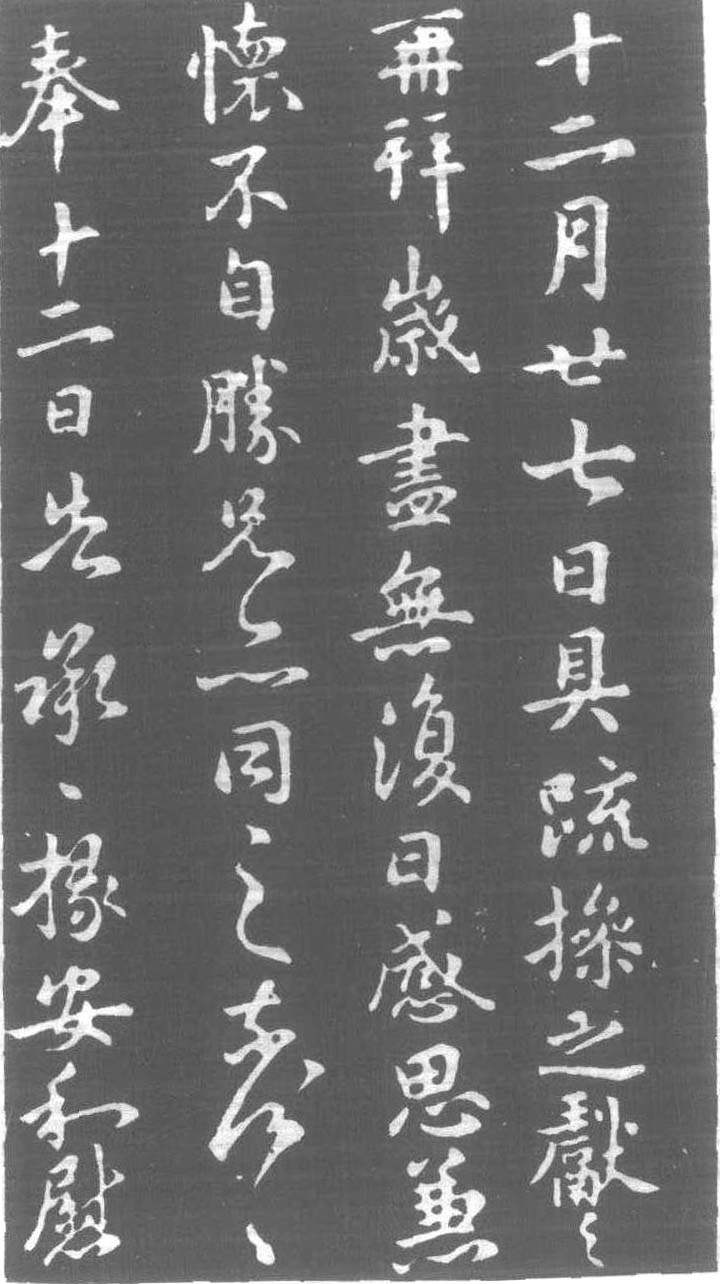 傳東晉王獻之書。為行書尺牘“十二月廿七日具疏操之獻之再拜歲盡無復日”云云十一行。書势重厚,字字示大令(獻之)之心,惟欠貫通之妙也。末句為“再拜”,而非“再行”。刻有《淳化閣帖》本。