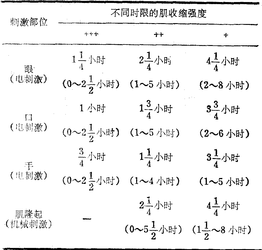 (4) 汗腺的超生反应 汗腺在肾上腺素、阿托品等药物作用下,死后30小时内可有发汗反应。检查时先用2~3%碘酒溶液涂抹皮肤,干后再涂细淀粉糊,然后按1:10配制蓖麻油-肾上腺素混合液皮下注射。出汗时淀粉颗粒会集结而形成透明区,于注射后60~90分钟反应最强,但也有不出汗者。 根据眼部变化推测 (1)眼压变化 人死后眼球变软。死后10分钟眼压为10mmHg; 20分钟则降到7mmHg。开放性颅脑损伤案例,眼压下降较快,眼球变软。 (2) 角膜混浊 死后数小时角膜开始呈点状或小斑块状混浊;半日~1日呈半透明状;1日半~2日高度混浊,难以透视瞳孔。角膜混浊受温度及环境条件的影响较大。在冰雪中,尸体角膜可长时间保持透明。 (3) 眼底变化 用眼底镜观察眼底。检查时每隔30~60秒用水或生理盐水湿润角膜。所见如下表。 上述检查较少受外界环境的影响,也与死者的年龄关系不大,估计死后时间颇有参考价值,但仅适用于死后一天以内。 死后眼底变化