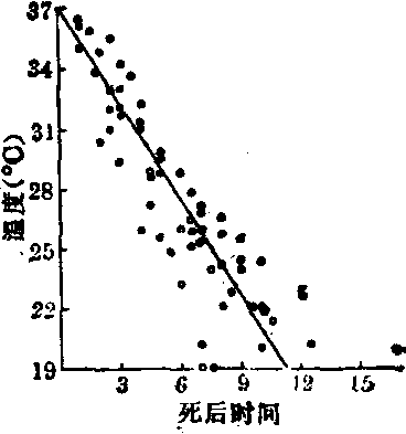 寒冷能使尸斑的移动性保持较久。失血和贫血时,尸斑弱或缺如。窒息死或急死时血液呈流动性,故尸斑出现早而明显。经久压迫尸斑若不退色,应切开,以与皮下出血相鉴别。 (2) 尸僵 最初发生僵硬的是小块肌肉,然后才是大块肌肉。当发现尸体小关节肌肉强直而大关节尚未强直时可推测死亡已1~2小时;如全身关节强直且全身上下完全出现尸僵,则死亡至少已8~16小时。在作此推测时,应充分考虑影响尸僵形成的各种因素如环境温度等。死后6~8小时用外力消除尸僵还可重现,但在全身尸僵充分形成后,再用力消除之,就不能再重现。尸僵一般可持续48~60小时,随后便行缓解。 死后1小时,肠壁因尸僵而呈收缩状,5小时左右达最高点,9小时后缓解。肠壁尸僵发生顺序,一般为十二指肠、空肠、结肠,但有时也可相反。心肌僵直常在死后1~2小时出现,持续一昼夜,有时持续11/2~2昼夜。心肌僵直可将血液自心腔中压出,心腔缩小,左侧尤甚,但也有右侧明显者。心肌变性时可不发生尸僵或僵直很微弱,此种情况下心脏扩张,腔内充满血液。 (3) 尸冷 人们曾认为只要测得尸温下降率,便可得知死亡时间。有的文献报道,死后4~10小时内,尸温平均每小时下降0.5~1.5℃;最初6小时平均每小时下降1.2~1.5℃。12~18小时后,平均每小时下降0.6℃。尸温下降虽有一定的规律性,但在很大程度上,甚至完全取决于尸体所处的环境条件,测温部位也有很大影响。一般认为,用普通温度计测尸体腋温来推测死亡时间是不准确的。直肠温,肝、胰、脾、肾等内脏温以及脑池温的测定则意义较大。测定脑池温得到的结果比较稳定,尽管它在不同情况下也会有变化,但一般不易受环境影响。右图是根据Schourup对16具尸体做脑池温测定所得63个数据绘制的。 ![]() 引自Schleyer F.(Methods of ForensicScience Vol. I)死后脑池温度 鉴于直肠温度的下降呈一曲线,其最初的平段受许多因素的影响,不易做到准确,故近几年来提倡用测定脑温的方法。隔一定时间测定,连测几次,计算出脑温下降的度数相当于脑与环境温差的百分数,以半对数座标描记,所得为一直线。据此推测死亡的时间,在死亡14小时内准确性较高。 (4) 腐败 腐败速度受环境影响很大,在我国中部地区,春秋季节腐败一般在死后24小时开始出现(腹部尸绿斑);夏季,于死后36小时腐败现象已很明显,死后第三日后全尸腐败;冬季,死后3~4日才开始腐败。但在我国南方,夏季经1~2日,冬季经5~7日已可形成巨人观。北方冰雪中尸体可半年不腐,故南北差异甚大,不可一概而论。 根据胃肠消化程度推测 一般说来,食后不久即死亡者,胃内充满未消化食物;食后1小时左右死亡者,胃内食物已变软。若胃内容移向十二指肠,约在食后2~3小时;胃、十二指肠尚有已消化的食物及其残渣,则约在食后4~5小时;胃和十二指肠均已空虚,则死亡可能发生在食后6小时以上。按此可推测饭后多久死亡,再根据最后一餐的时间,即可推测死亡时间。 根据尸体化学推测 尸体化学成分变化受多种因素影响,诸如环境条件、生前体质、所患疾病及死因、濒死期的长短等。因此,测定死后化学成份的变化藉以推测死亡时间,应考虑到上述有关因素。 (1)氨基酸氮 尸体内蛋白质被酶分解而使血液、脑脊液,眼玻璃体液的游离氨基酸氮增高。在死后的头20小时内、血液及脑脊液中的氨基酸氮增加虽不多但有一定规律。死后3~4小时,血中氨基酸氮不超过18~19mg/100ml;死后12小时,可增至30mg/100ml;死后20小时,尤其在48小时以后,氨基酸氮的增加就变得很不规律。氨基酸氮定量如不超过14mg/100ml,一般可推测死亡时间未超过10个小时。 (2) 非蛋白氮 在排除肾功能不全的前提下,如果尸血尤其股静脉血的非蛋白氮不超过50mg/100ml,可推测死亡时间不超过12小时; 如果脑脊液的非蛋白氮低于70~80mg/100ml,则死亡一般未超过24小时。 (3) 肌酸 血液中的肌酸受肾功能不全影响较大,但脑脊液中的则受影响较小,并与死亡后经过时间关系密切。人死后30小时内,脑脊液的肌酸多不会超过10mg/100ml;死后40小时肌酸含量趋于下降。在排除肾功能障碍的前提下,如血浆肌酸不超过11mg/100ml,则死亡时间可能不超过28小时; 如果血浆肌酸含量为5mg/100ml,或脑脊液为6mg/100ml,则死后不超过10小时。 (4) 氨 外周静脉的血氨浓度,在死后8小时内为1~3mg/100ml,如超过3mg/100ml便可推测死亡超过8小时。检材最好取自股静脉或锁骨下静脉,并应即时检验,否则要在冰箱保存。血样品溶血、污染以及肝病或败血症死亡者的血液都不宜做此检验。氨的检验,脑脊液优于血液。脑脊液氨,随死后时间延长而呈直线上升。如果浓度在1mg/100ml以下,则为死后不久; 如果超过8mg/100ml,则死后时间在60小时以上。 (5) 钾 死后因细胞内钾向细胞外转移,致使血及脑脊液钾显著增高,很难据以推测死亡时间。眼房水及玻璃体液内的钾,死后也可上升且不受年龄及环境因素影响。此项测定值是迄今研究过的各项尸体化学指标中最有意义的指标之一。死后大约每小时升高0.17mEq/L,不同个体可能有变异。如能在不同时间分别抽取二只眼的玻璃体液进行测定,则可获得较准确的结果,特别是在死后12小时内测定,误差仅±1.1小时。 (6)氯 血浆氯因向红细胞内转移而下降,死后24小时平均浓度下降到80~90mEq/L。每小时约下降0.25~1mEq/L。脑脊液氯也因死后向细胞内转移而下降,生前为125mEq/L,死后10.5小时降为113mEq/L。 (7)磷 血清无机