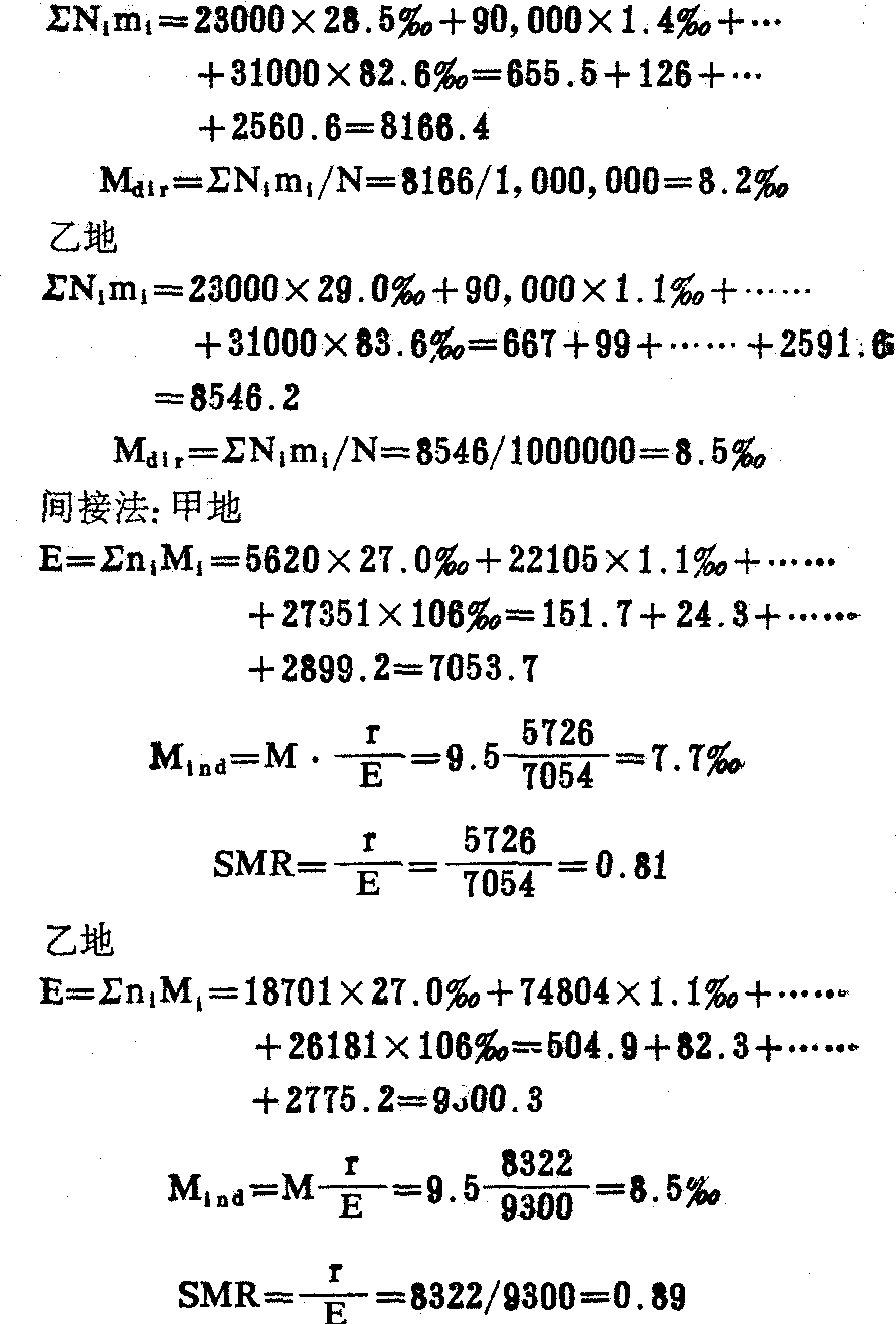 (2) 性别、年龄组死亡率:男女性人口死亡率不同。说明死亡率的性别差异可用分性别的死亡率。 大多数国家及地区的女性死亡率低于男性,只有妇幼保健较差的地区,育龄期妇女的死亡率才高于男性。 年龄是影响死亡率的重要因素。死亡率的年龄变动可用年龄组死亡率来分析。 年龄组死亡率的变动特点是新生儿死亡率很高,以后随年龄增加而迅速下降,一般在10~14岁达最低点,从15岁起死亡率又随年龄而上升。不同国家或地区人群的死亡率水平可以有较大差别,但年龄组死亡率的曲线类型基本相同。 标准化死亡率 由于各年龄组死亡率相差很大,粗死亡率受到人口年龄结构的影响。婴幼儿人口比重较大,或老年人口比重较高的人群,粗死亡率比较高。对同一人群,即使各年龄组死亡率不变或甚至有所下降,也可能由于婴幼儿及老年人口比重上升而使粗死亡率升高。因此,在比较分析不同地区、不同人群的死亡率,或者作同一人群死亡率的动态分析时要考虑到人口年龄结构不同或改变对死亡率的影响。为消除人口年龄结构不同或改变对死亡率的影响可以用标准化法计算按年龄标准化(调整)的死亡率。常用的标准化法有直接法及间接法。 直接法标准化是用分年龄组的标准人口数或标准人口构成为权数,计算各年龄组死亡率的加权均数。 则用直接法求标准化死亡率(Mdir)的计算公式为 标准人口构成一般用全国普查人口的年龄构成,但也可以用任何其他公认或假定的人口年龄构成。假定0~60岁各年龄组人口数相同,则可以用各年龄组的组距(I)为权数求得标准化死亡率,称为“平均加权死亡率”(EADR)。 如果只知道待标人口中的死亡总数 (r),而不知道死亡者的年龄分布,或者因待标人数较少而各年龄组死亡率的随机误差太大时,可以用间接法计算标准化死亡率。用间接法求标准化死亡率(Mind)的计算公式为 上式中E为待标人口按标准人口的年龄组死亡率(一般取全国普查人口的年龄组死亡率) 计算的期望死亡总数,E=∑niMi。设Me为待标人口的期望死亡率,Me= ![]() 上式中M/M ![]() 〔例〕 甲、乙两地各年龄组人口数、死亡数及死亡率如附表(1)~(6)栏。试用直接法及间接法求标准化死亡率。直接法:甲地 除了分男女性各年龄组计算死亡率外,还可以按居住地区、婚姻状况、职业及其他社会经济因素等分别计算死亡专率,以分析影响死亡率的因素。 死亡率的变动是衡量一个国家或地区社会卫生状况的