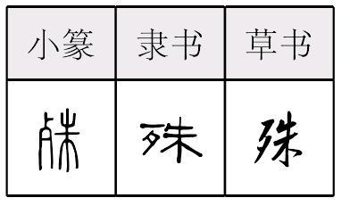 ❹ 时异势殊|言人人殊 殊 金文; 篆shū[歹(意符)+ 朱(聲符)→殊(《説文》:“殊,死也。從歺,朱聲。漢令曰:‘蠻夷長有罪,當殊之。’”殊,不同。)] 《詩經·魏風·汾沮洳》:“美如玉,殊異乎公族。”(他美德潔如玉,遠遠不同其公族。) 《周易·繫辭下》:“天下同歸而殊途,一致而百慮。”(天下萬事萬物從不同的道歸向同一目標,千思百慮最後歸於統一的觀念。) 殊shū(10画)