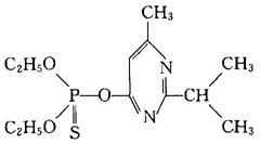 又称地亚农、二嗪农。 广谱有机磷杀虫剂。化学名称:O,O-二乙基-O-(2-异丙基-4-甲基嘧啶-6甲基)硫逐磷酸酯。化学结构式如下。纯品为无色、无臭油状液体,沸点83~84℃(266.6×10-4Pa),密度1.116~1.118,蒸气压186.7×10-4Pa。常温下水中溶解度为40mg/kg,可与乙醇、丙酮、二甲苯混溶,在水或稀酸中逐渐分解,在稀碱中稳定,在强碱中很快分解,挥发性强。对害虫和螨类具有很强的触杀、胃毒作用和较好的熏蒸作用,对一些害虫有杀卵作用。 渗透作用较强。速效,叶面喷雾药效期较短,但在土壤内,药效期长。可应用于水稻、甘蔗、玉米、棉花、蔬菜、果树、烟草、花卉等,防治食叶害虫、钻蛀性害虫、刺吸口器害虫及地下害虫。对大鼠急性口服LD50为250~285mg/kg,急性经皮LD50为455~900mg/kg,吸入急性LC50为3.5mg/L(4h)。ADI值为0.002mg/kg。日本规定稻米、大豆、果实、茶、蔬菜上的允许残留量为0.1mg/kg。
