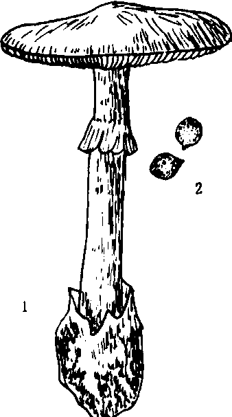 真菌门、担子菌纲、伞菌科、毒伞属。也叫绿帽菌。子实体伞状,菌盖宽3~11厘米,表面具光泽,有不明显的放射状隐条纹,棕褐色、烟灰褐色、暗绿色 1、子实体 2、担孢子等,有时稍粘。菌肉白色。菌褶白色稍密。菌柄白色,圆柱形,脆,空心,光滑或有细毛,有时有花纹,基部膨大,长5~18厘米,粗0.6~2厘米。菌环白色膜质,生菌柄上部,下垂,环上有纵条纹。菌柄基部的菌托大型苞状,白色。孢子,近球形或卵圆形。产于江苏、安徽、福建、广东、广西等地,6~9月在林中地上单生或群生。极毒,含毒伞肽和毒肽,损害肝、肾、心、肺、大脑中枢神经系统等。发病慢,潜伏期数小时至1天,病死率高。经小白鼠试验,每公斤体重用干品20克的提取液腹腔注射,死亡率为60%左右。