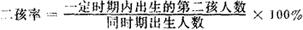 一定时期内(如一年、半年、一季等)出生的婴儿中属于第二个孩子的人数比例,以百分数表示。计算公式是: