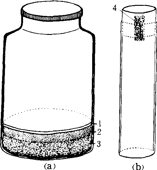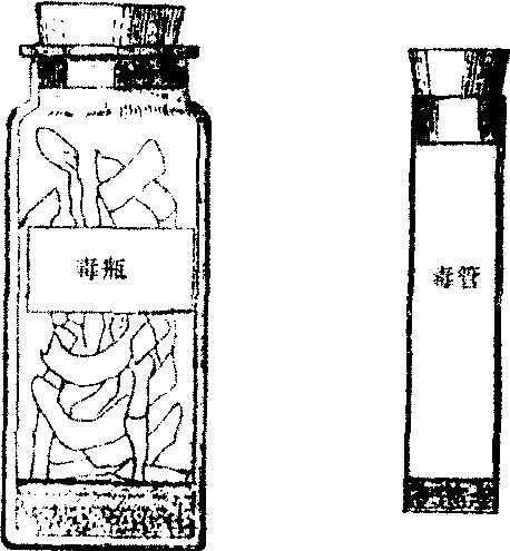 释义 | 毒瓶killing bottles盛有剧毒药品的杀虫工具。用于杀死所采集的昆虫,以制作完整的标本。可选用瓶盖密封性能好、开启方便、透明且不易碎的玻璃瓶制作。瓶的形状依采集者需要自选。先将氰化钾(或氰化钠)铺于瓶底,加入水杨酸数粒,促其挥发。嗣后在氰化物上放上锯末,压平后再放入5~7毫米厚的生石膏粉,轻微震动将石膏舖平,滴入几滴清水以湿透石膏,石膏变硬后,上舖吸水滤纸,以保持瓶内清洁,即可使用。氰化物剧毒,制作和使用毒瓶时须注意安全,随用随将瓶盖盖紧,不使毒气外逸。遇毒瓶破损,当掘土深埋。如无氰化物,可用乙醚或三氯甲烷(氯仿)代替,用时将药液滴入插在瓶塞内装满脱脂棉的小玻璃管中。由于这些药品易于挥发,要随时添加才能保持杀虫效果。乙醚和三氯甲烷都是强麻醉剂,不可久闻(见图)。