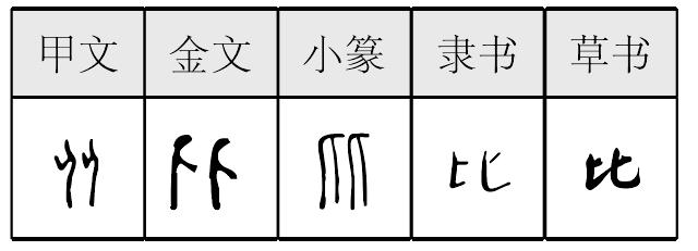 比 甲骨文; 金文; 篆bǐ [比,妣本字(《説文》:“比,密也。二人爲從,反從爲比。”古文像兩女子相互“比較”,因聲、意假借爲比。較量〈比較,比高低,比賽,對比〉,把物擬人或把人擬物〈比擬,比方〉。緊靠〈比肩作戰〉,引申爲勾結〈朋比爲奸〉,屢屢,到處〈比比皆是〉。)] 《詩經·邶風·谷風》:“既生既育,比予於毒。”(如今日子過得好,你反把我當毒草。) 《論語·爲政》:“君子周而不比,小人比而不周。”(君子團結而不勾結,小人勾結而不團結。) [西漢] 司馬遷《史記·樂書》:“比音而樂之,及干戚羽旄(máo),謂之樂也。”(排比各種音符組成曲調,加上手執盾、羽、牛尾的舞蹈,就成了完整的樂曲。) [宋] 李清照《醉花陰》:“人比黄花瘦。”